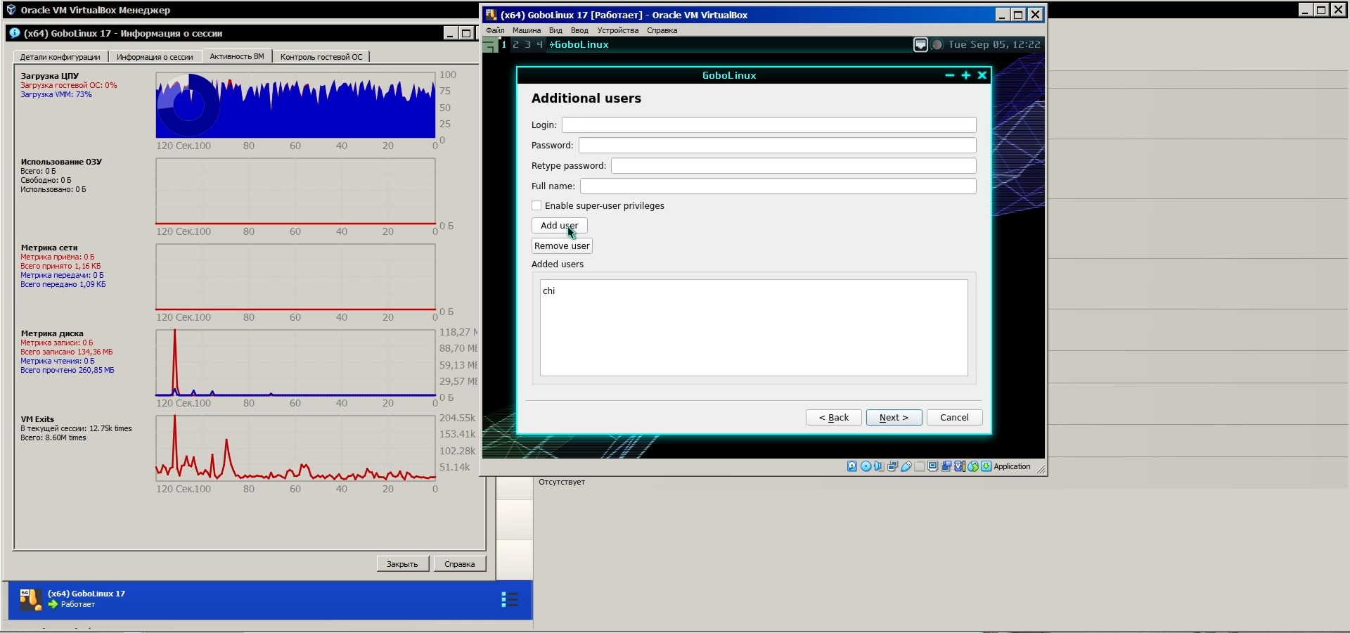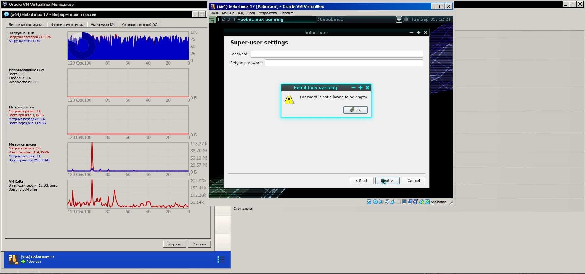 Учётную запись root нельзя создать без пароля, но учётную запись обычного пользователя можно сделать без пароля, так же дистрибутив позволяет выбрать по какому стандарту должны работать часы, по локальному времени BIOS или GMT: