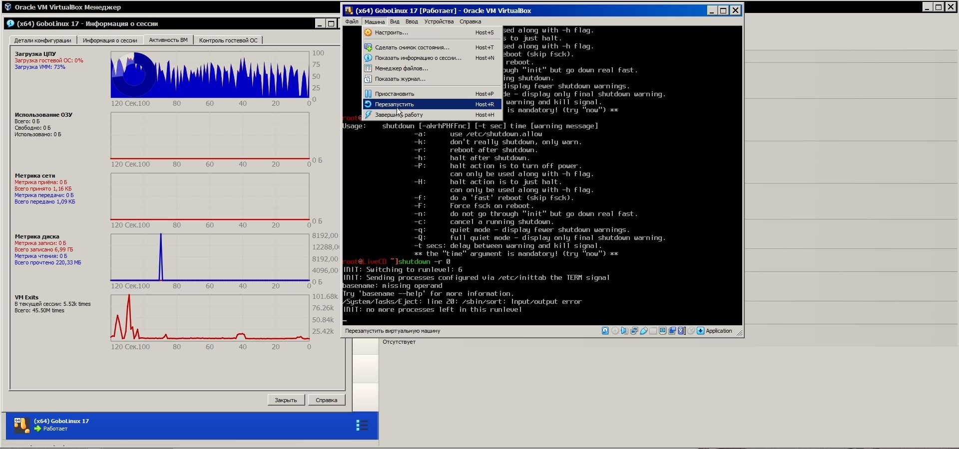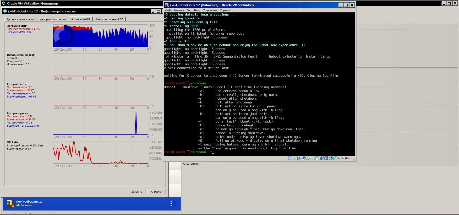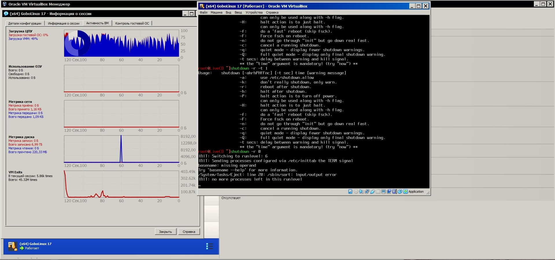 Но с выключением возникли проблемы, "линукс" просто завис и не выключается, похоже не может выключиться потому что загрузочный диск был извлечён, но его ведь нужно было извлечь иначе после перезагрузки система с него загрузится, а нужно ведь нужно с жёсткого диска грузить, так что выхода нет, делаю жёсткую принудительную перезагрузку: