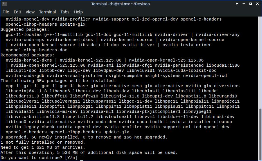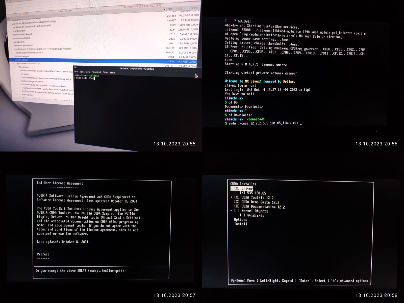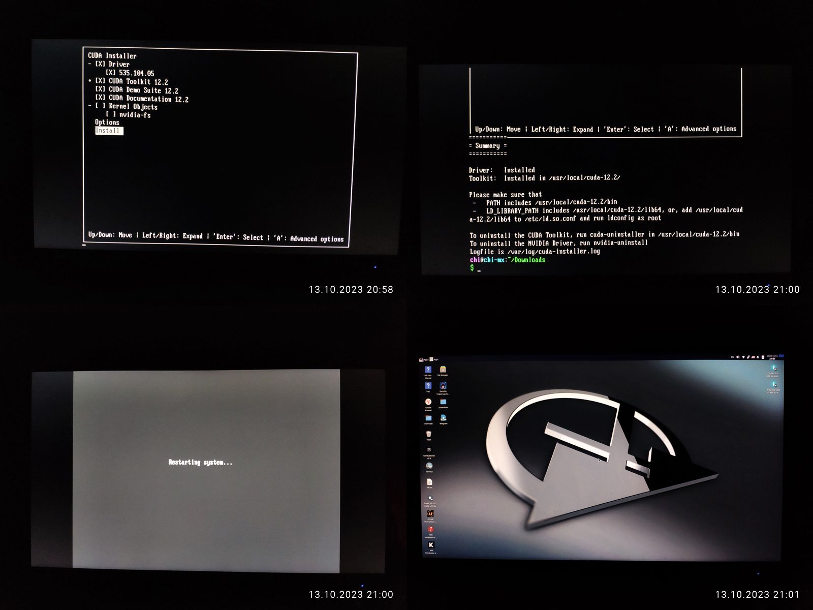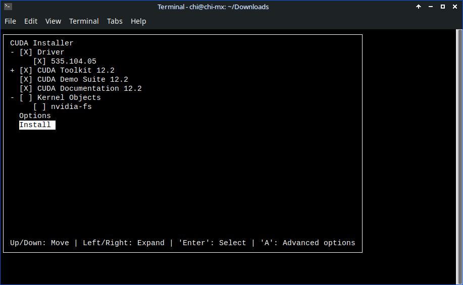 Ломаю Xorg server, ибо наверняка будут лишние проблемы если это не сделать, и устанавливаю CUDA 12.2.2 с настройками по умолчанию, никаких индикаторов прогресса, всё вслепую устанавливается, так как я уже знаю как устанавливать в линуксах драйвер, то процесс завершился без ошибок, но у обычных пользователей наверняка прибавится лишнего геморроя на голову...