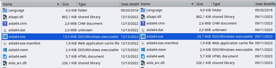 Причём если обратить внимание, это безумие увеличило размер исполняемого файла более чем в 2 раза, слева AIDA64 v6.85, справа AIDA64 v6.92:
