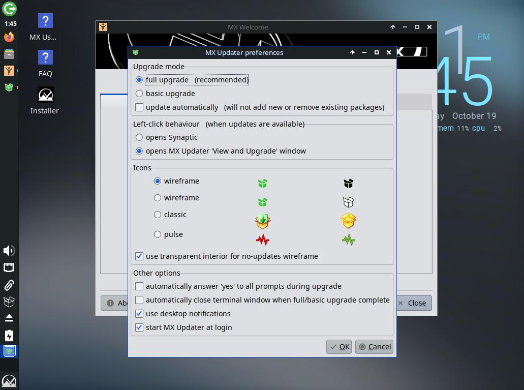 Короче начинаем с нуля, так как я наверняка буду отвлекаться в процессе установки дистрибутива, сразу же настраиваю и закрываю MX Updater, ибо в настройках нельзя полностью отказаться от проверки обновлений... А после вовсе блокирую дистрибутиву доступ к интернету, ведь закладки в планировщике задач никто не отменял, спустя некоторое время они сработают, и дистрибутив благополучно начнёт насасывать списки репозиториев без моего разрешения, а оно мне не надо, и даже вредно для системы в целом: