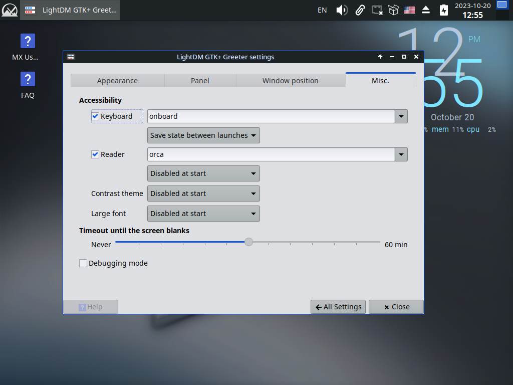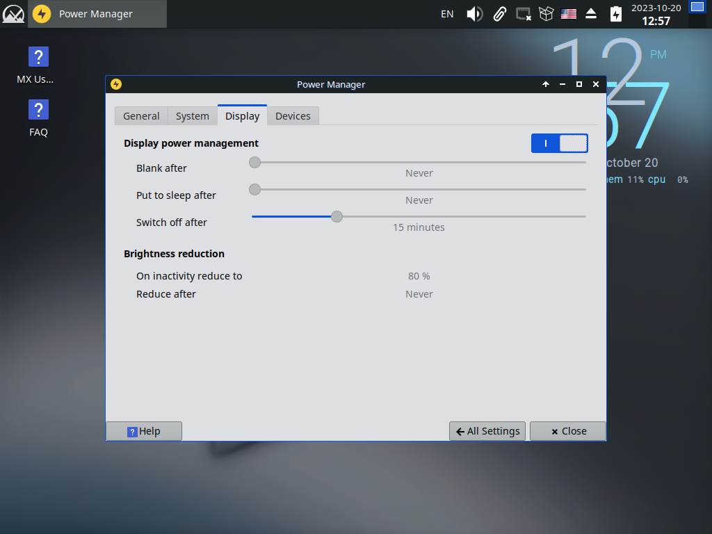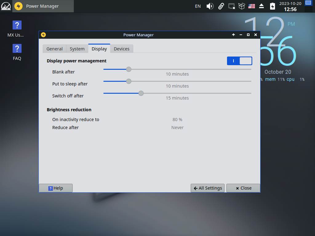 Единственное, что я не отключал, это выключение монитора спустя 15 минут бездействия, ибо это действительно полезный функционал, и обычно не приводит к разнообразным проблемам на ровном месте... Теперь можно спокойно оставить виртуальную машину и не бояться того, что дистрибутив сам себя поломает перейдя в спящий режим, хотя именно за MX Linux такого лютого косяка вроде не замечал.