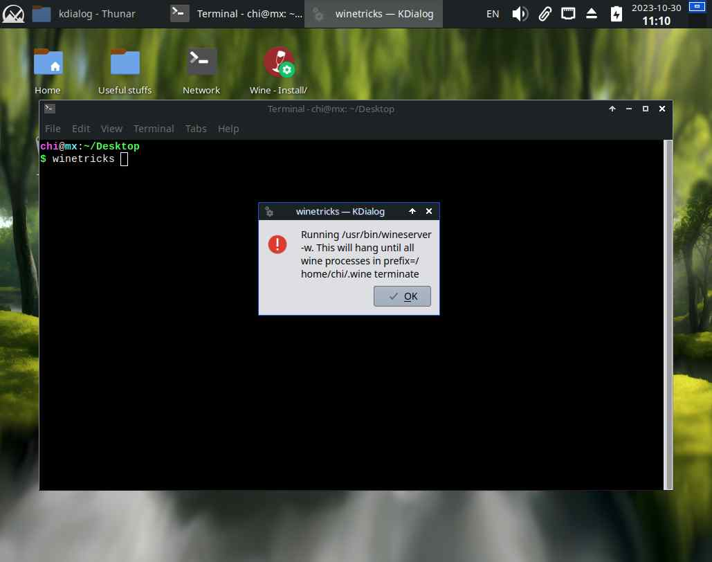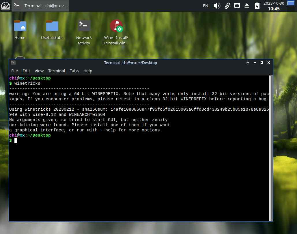 Вот вроде и появился ярлык winetricks в меню "пуск", но по нажатию ничего не происходит, и только через танцы с терминалом становится понятно, что нужно установить дополнительные костыли, впрочем, в линуксах практически всё через бубен и костыли происходит, чему тут удивляться, моя задача сейчас как раз в том, чтобы пользователю не приходилось так танцевать с бубном и костылями: