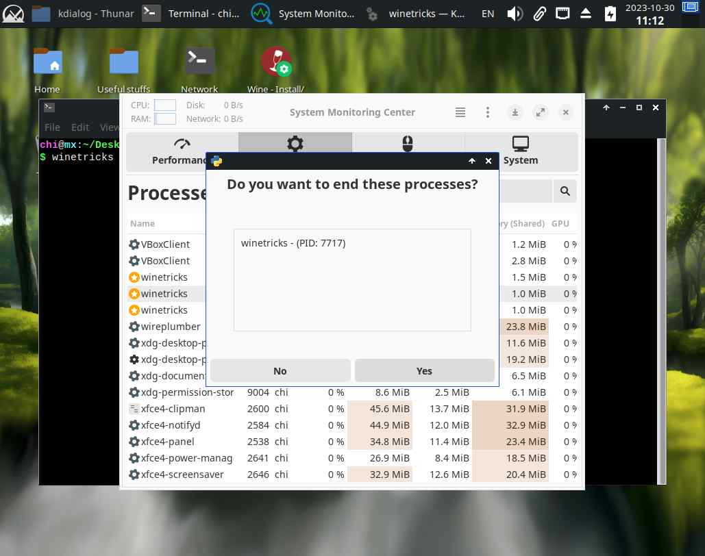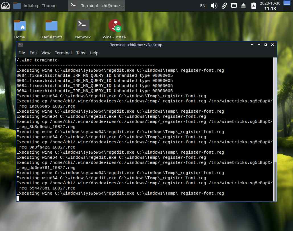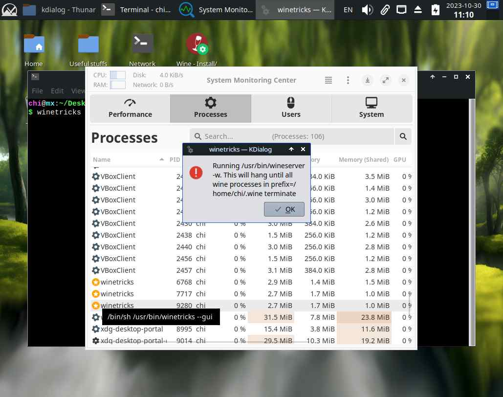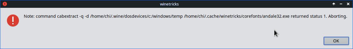 Хотя ладно, это дерьмо загадило рабочий стол "ошибками", говорит что там постоянно что-то зависает, и Wine всё закрывает... Этот флуд ошибками остановился после уничтожения процессов winetricks, и это было очень похоже на бесконечный цикл, ведь у "линуксоидов" лапки вместо рук, и они не осилили адекватный интерфейс с индикатором прогресса работы: