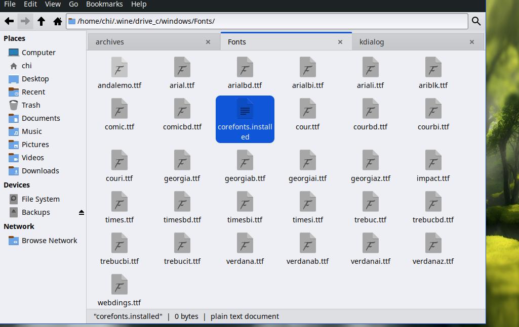 Как же удалить шрифты из Wine? Легко и просто, если конечно линукс живёт в виртуальной машине, а пользователь создавал точки отката, хотя наверное можно было бы сделать копию папки "wine", и мне не приходилось бы заново устанавливать kdialog, ну да ладно: