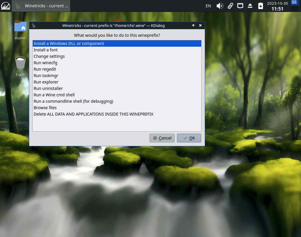 Ну да ладно, устанавливаю kdialog, запускаю winetricks, и оно вроде заработало: