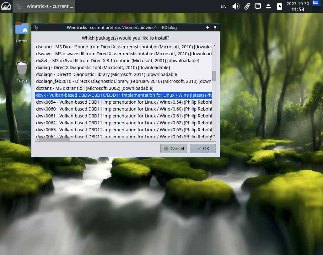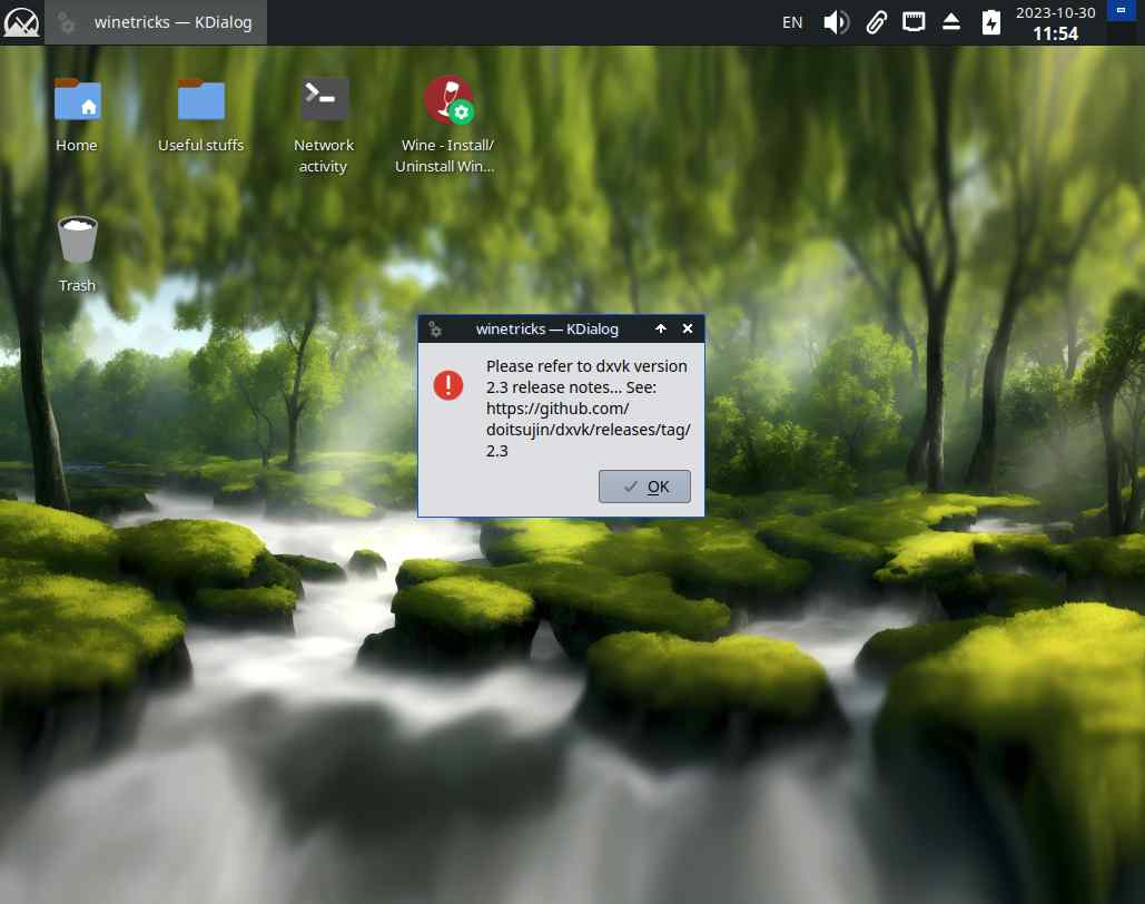Ну что, время установить dxvk, и тут я понял, что kdialog хуже zenity, конечно, и то и другое кривой хлам, но если выбирать лучшее среди худшего, то пожалуй ещё раз откачусь к точке восстановления...