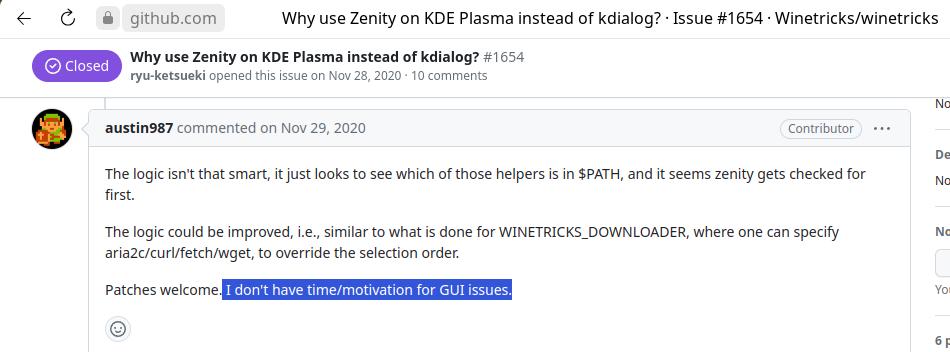 Кстати, решил я заглянуть в интернет, поискать информацию что лучше, zenity или kdialog, но ничего интересного не нашёл в итоге, ну разве что нашёл как контрибьютор жалуется на отсутствие времени/мотивации для исправления косяков интерфейса: