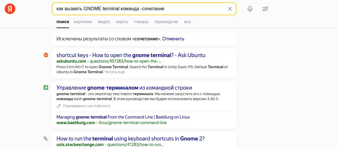 Да и в Linux, как всегда, всё через одно место, и похоже для каждого терминала придётся вручную искать команду запуска, ведь в Wikipedia никто не удосужился прописать команды вызова для каждого терминала, да и в интернете инструкции рассказывают в первую очередь про корявые сочетания клавиатуры, пришлось немного потанцевать с бубном над поисковиком, чтобы наконец найти злополучную команду "gnome-terminal":