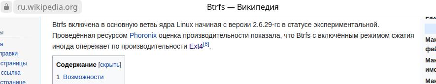 А в Википедии вовсе говорят, что BTRFS иногда даже опережает EXT4 в производительности! Просто чудо какое-то, а не файловая система!