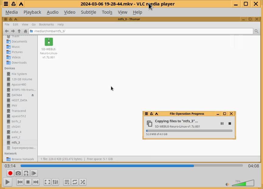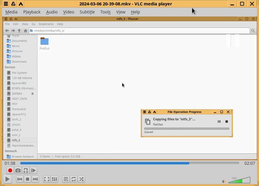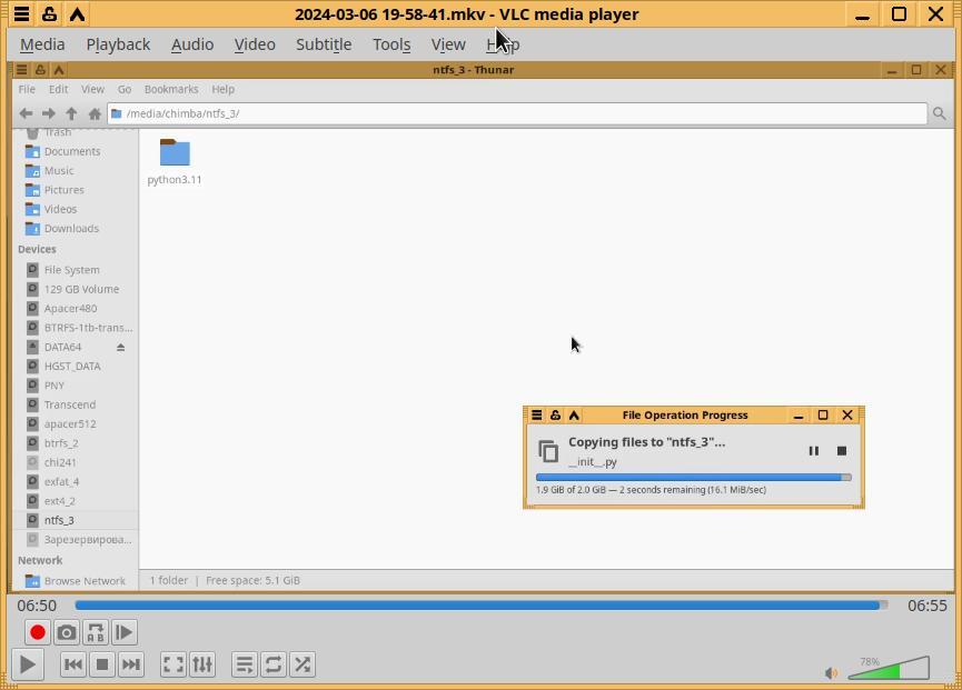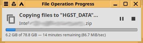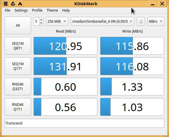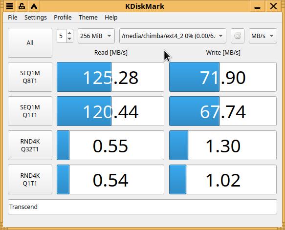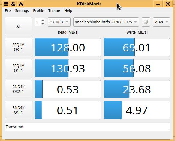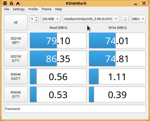 И вот NTFS, скорость в конце 98 МиБ/с, времени потрачено ~47 секунд, это даёт среднюю скорость около 87 МиБ/с, (~92 MB/s), что явно больше 74-86 MB/s измеренных линуксоидным синтетическим тестом KDiskMark: