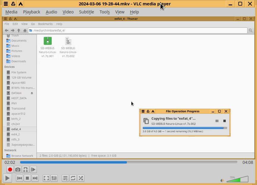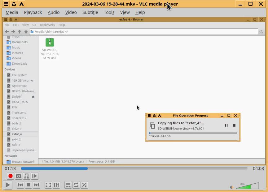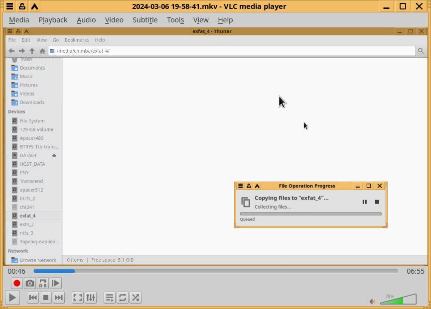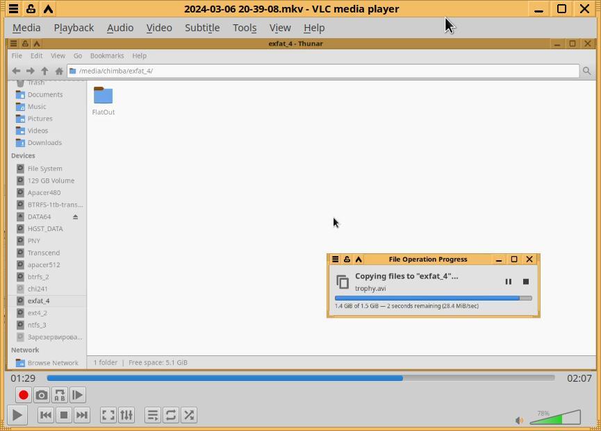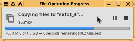 Далее exFAT, под конец скорость ~76 МиБ/с, занято ~50 секунд времени: