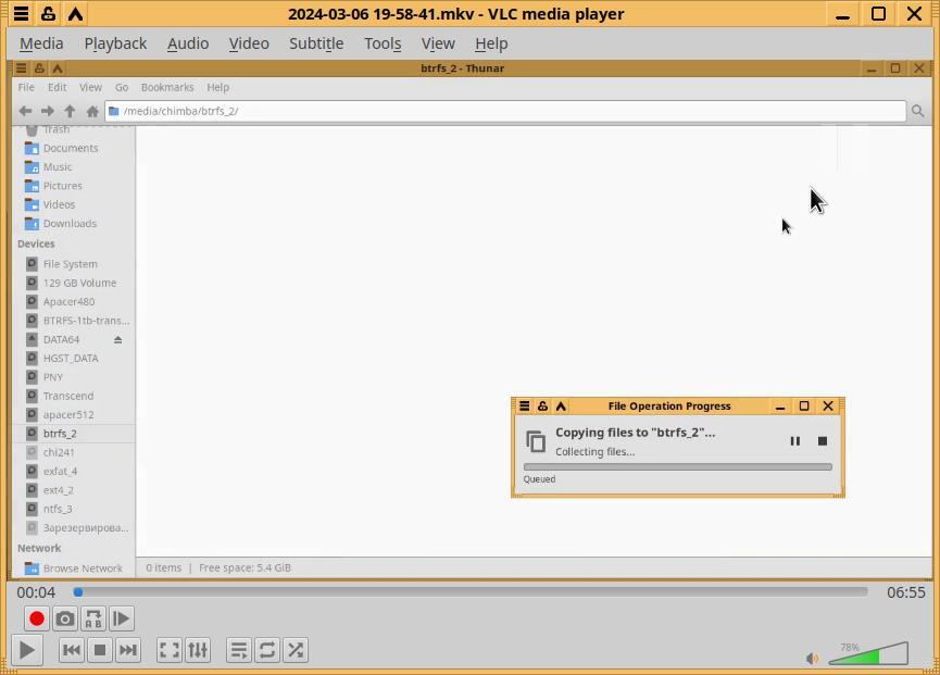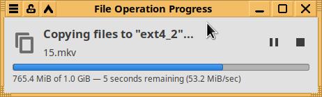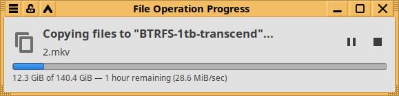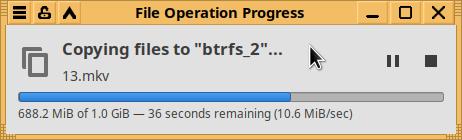 Первой протестирована BTRFS, в конце копирования скорость была около 70 МиБ/с, потрачено 57 секунд: