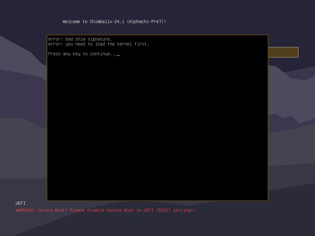 Так как используемое ядро Linux не подписано, системы с активным Secure Boot откажутся работать, потому было добавлено специальное уведомление красным цветом, чтобы пользователи сразу знали в чём может быть проблема при ошибке "bad shim signature":