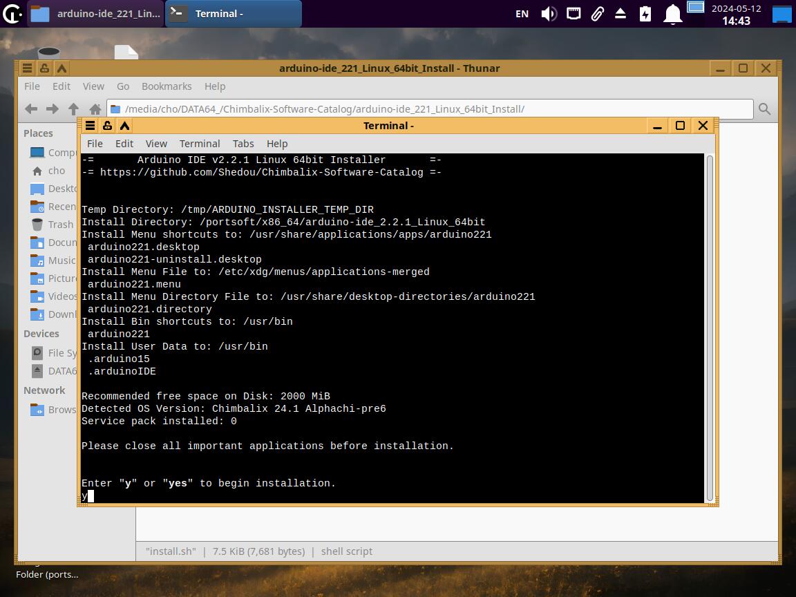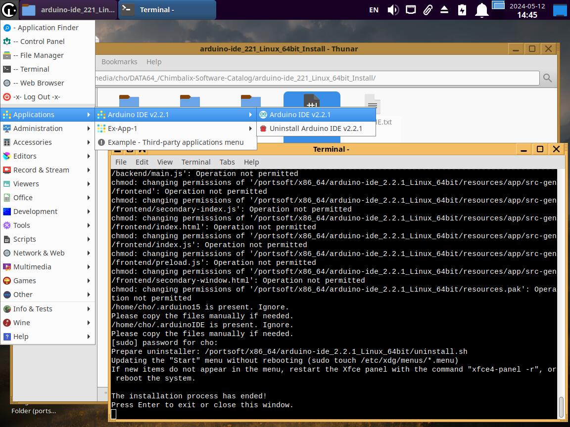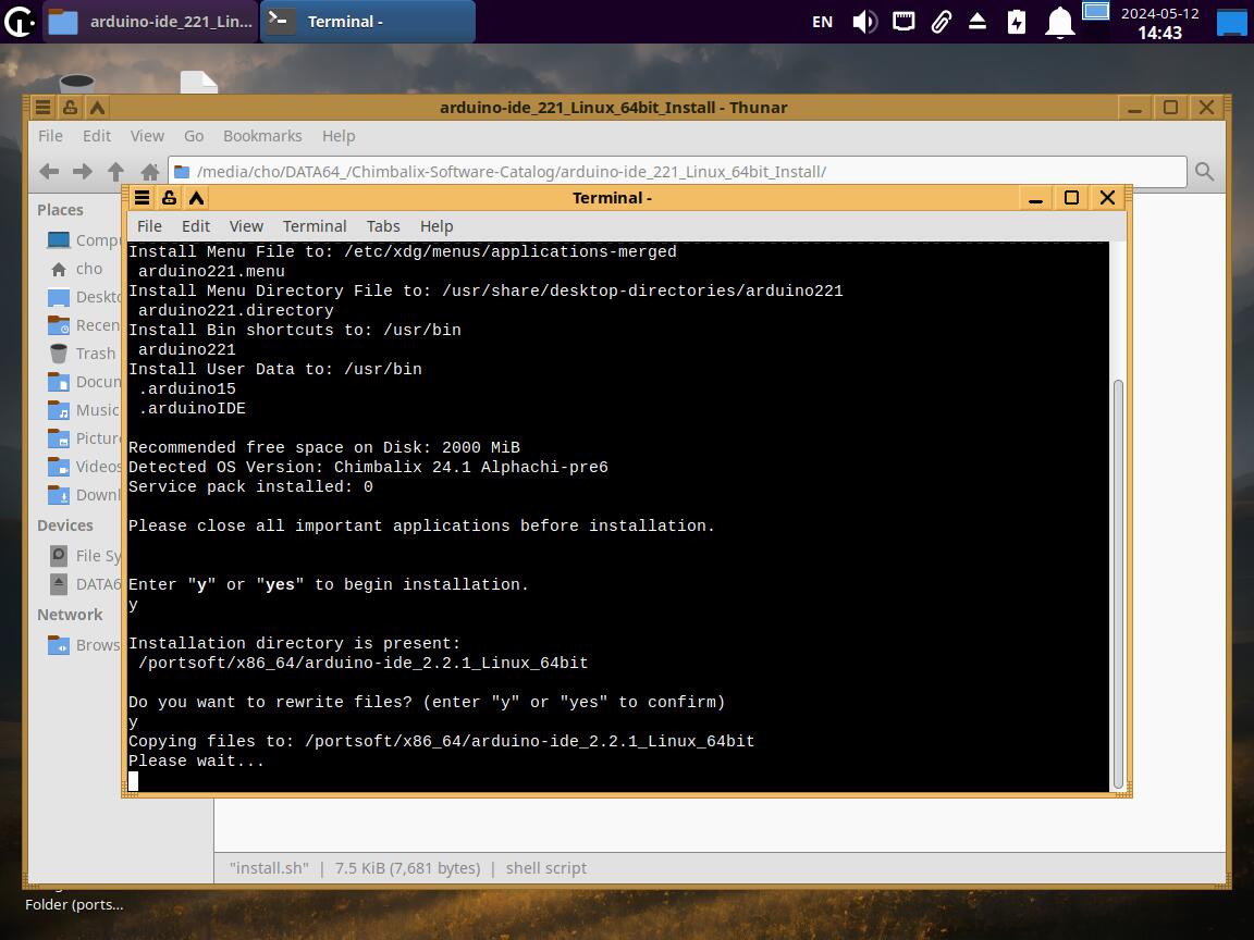 Как оно работает? Правильно, запускаем файл "install.sh" и устанавливаем, правда сейчас я это делаю в Pre6 версии дистрибутива, а там Arduino IDE уже установлена из коробки, но ничего страшного, всё работает, ведь для установки приложения используется каталог "PortSoft":