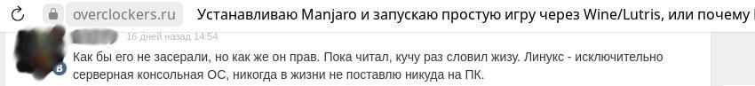 Конечно же порой в комментарии заглядывают и обычные люди, что уже столкнулись с кривыми линуксами на своём опыте, и это практически всегда разные люди, тем временем некомпетентные адепты Linux, упустившие два жирных шанса меня действительно упрекнуть за маленькую "ошибку", обычно представляют собой одно и то же крикливое меньшинство, постоянно кричащее под любыми неугодными статьями в интернете что-то вроде "автор идиот криворукий".