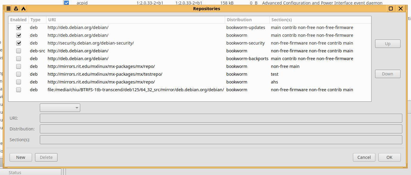 Следующая особенность, это отключенные по умолчанию репозитории MX Linux, просто от греха подальше. Кому надо - включит. Ну и оставил отключенной запись локального репозитория чисто для самого себя, а для тех, кто захочет подключить свой локальный репозиторий - не забывайте про дерьмо с правами на каталог пользователя в "/media/":