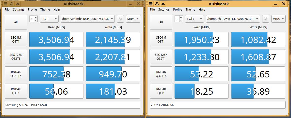 Ну и чтобы разбавить статью, добавлю небольшое сравнительное тестирование скорости SSD Samsung 970 PRO 512GB, на реальной системе и в виртуальной машине Virtualbox: