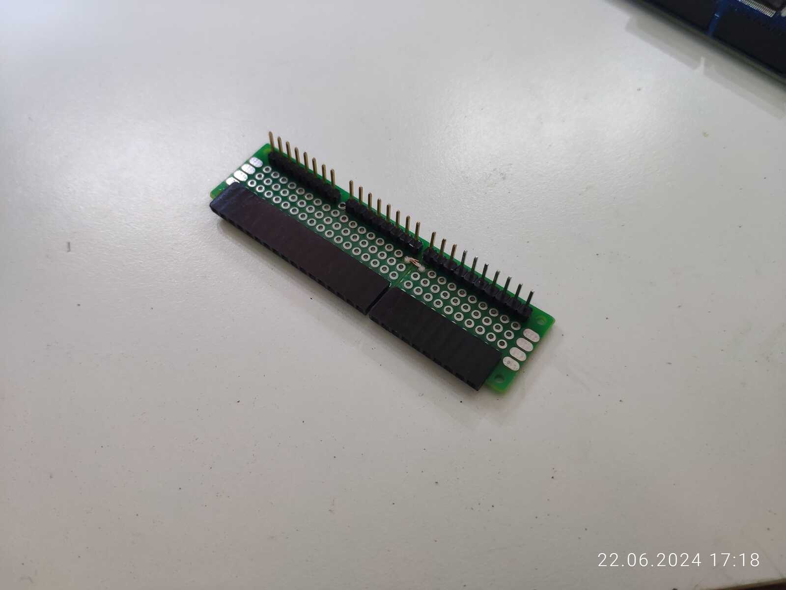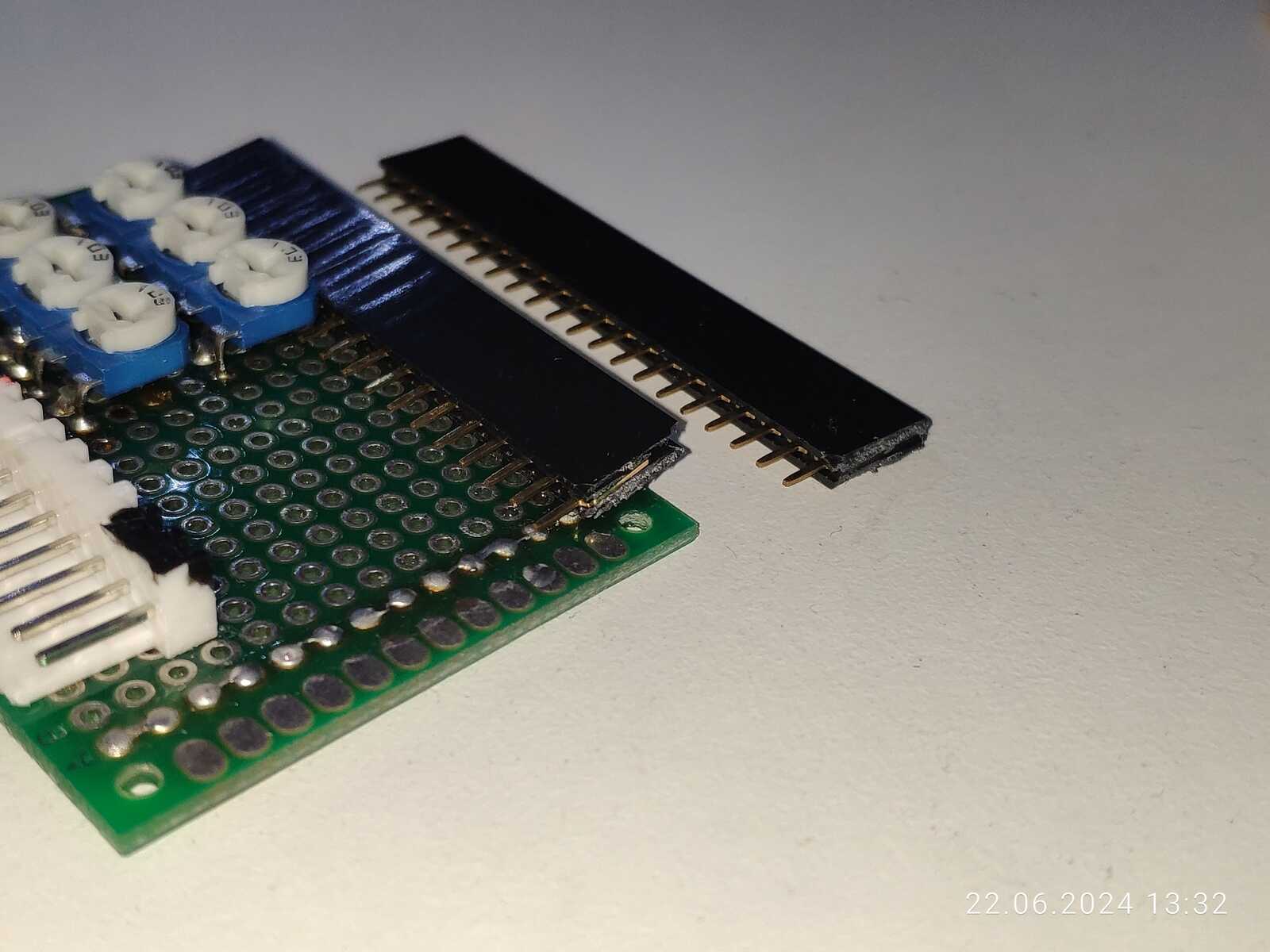 Сбоку всего 13 входов получится реализовать, хм, хотелось бы больше, да и подключения к плате выйдут не прямой линией, а углом, что не очень хорошо... Решено! Припаяю колодку с противоположной стороны от коннекторов! Так выходит 18 контактов, чего предостаточно должно быть, и соединение выйдет прямое, никаких ответвлений в стороны: