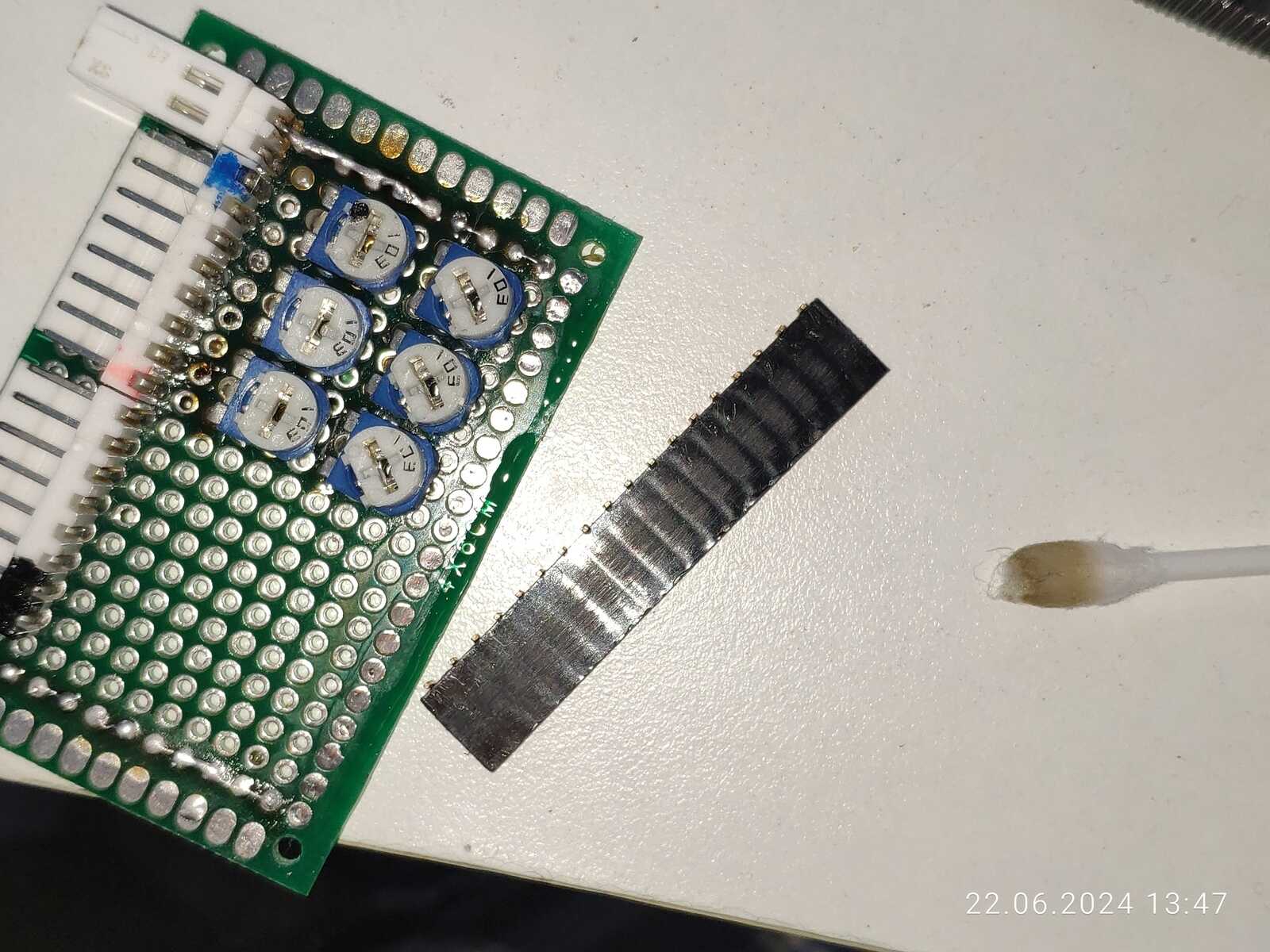 Далее нужно убрать канифоль из-под гнезда, поможет ватная палочка со спиртом, кстати, очень не советую спиртом протирать покрытые лаком поверхности, далеко не каждый лак устойчив к спирту, но это так, небольшое отступление: