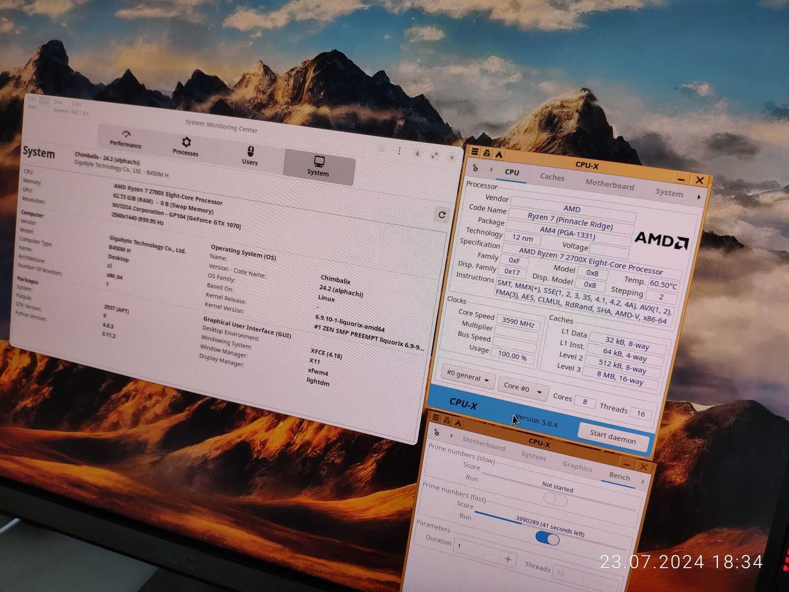 Конфигурация ПК прежняя, Ryzen 7 2700X с отключенным XFR Boost и ограниченной частотой ядер до 3.6 ГГц, видеокарта GeForce GTX 1070 и 64 ГБ оперативной памяти, драйвер видеокарты NVIDIA 550.54.14: