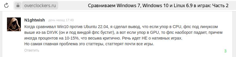 А если кто-то рассказывает, мол, под линуксом при запуске Windows игр через Wine (Proton) нет никаких фризов и статеров, этот человек либо откровенно врёт, либо уже прошёл этап компиляции шейдеров, и не понимает как оно связано с проблемой, либо производительность системы достаточно высокая, чтобы свести к минимуму всё дерьмо связанное с компиляцией во время игры, но компиляция шейдеров прямо в процессе игры (и её последствия) ни от одного из вариантов никуда не исчезает.