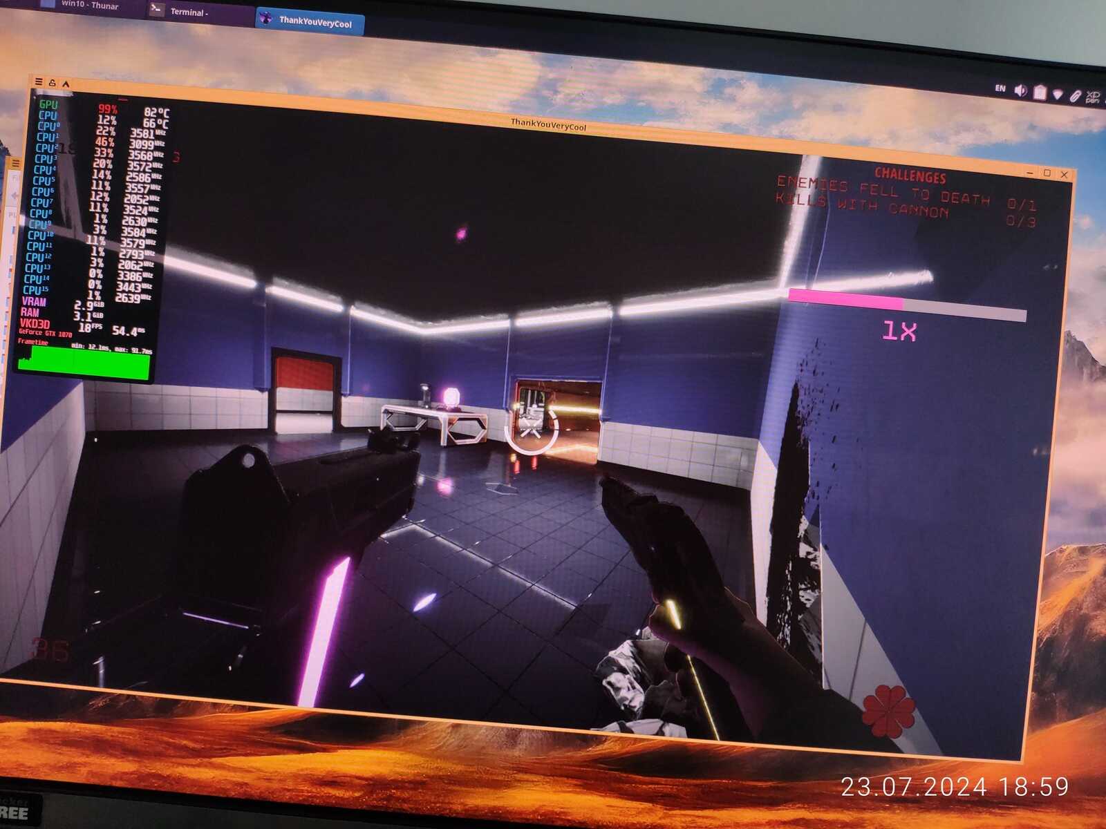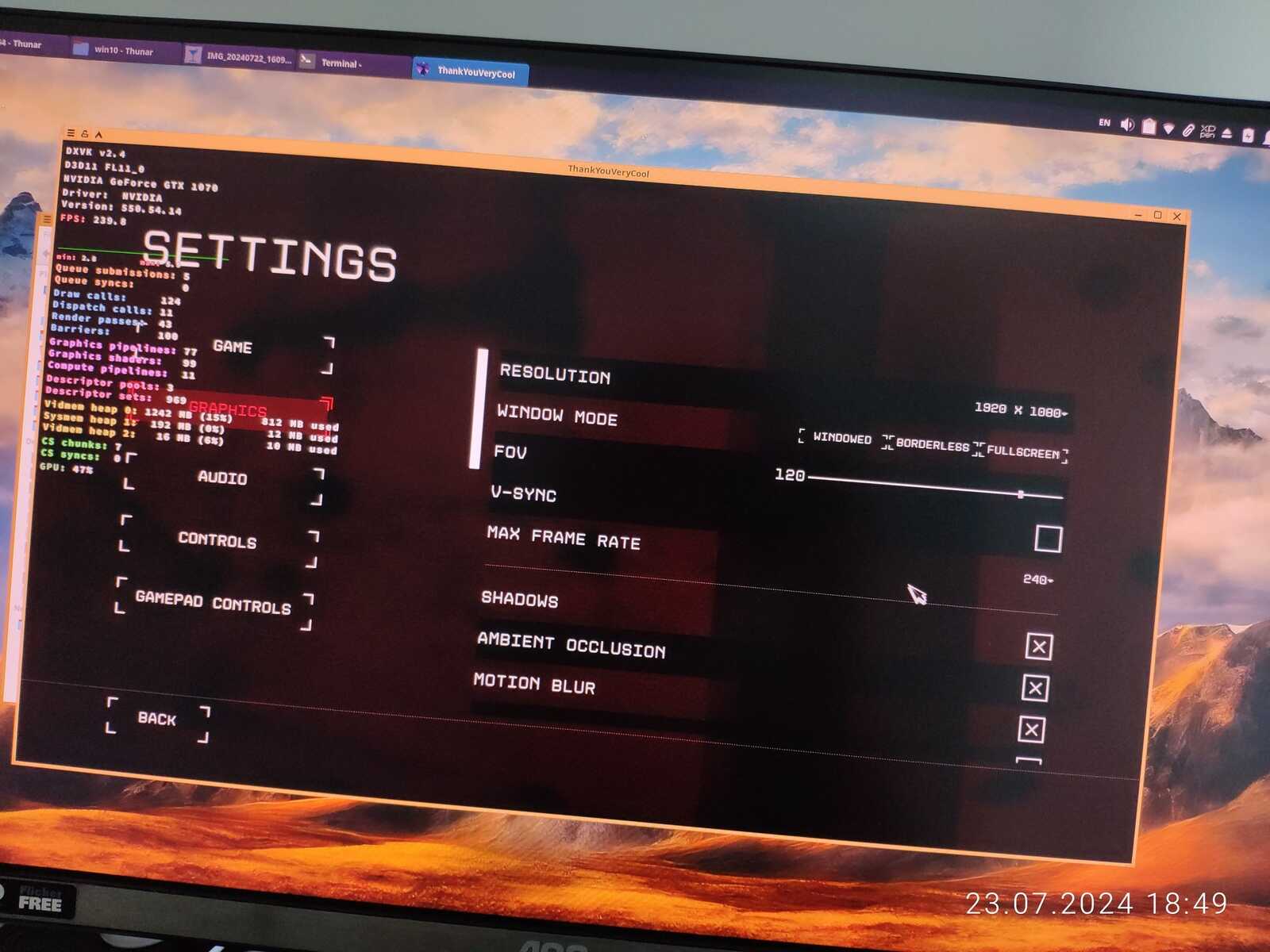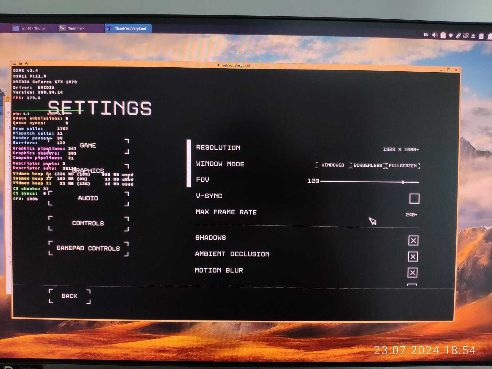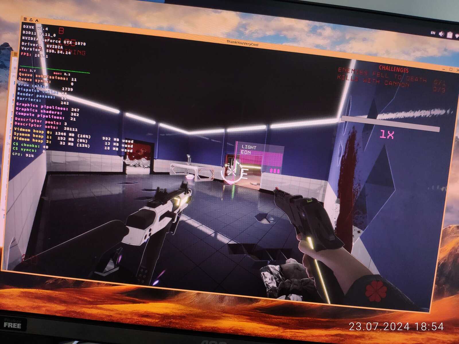 Готово, в режиме DirectX 11, как обычно, Linux демонстрирует не лучшую производительность относительно Windows, однако на высоких настройках DXVK в среде Windows выдавал 125 FPS, что довольно странно, слишком большое падение относительно нативного режима работы и Linux.