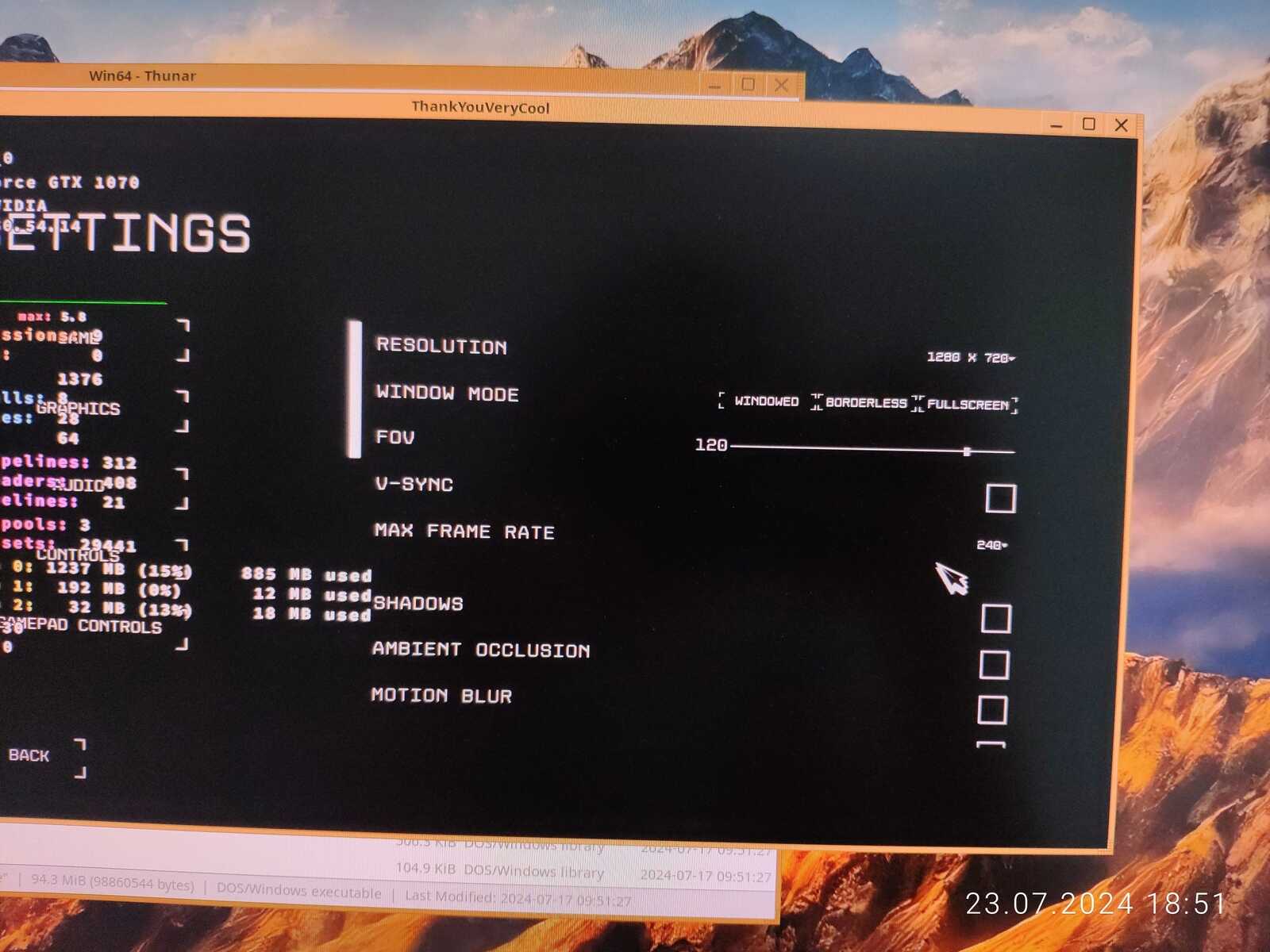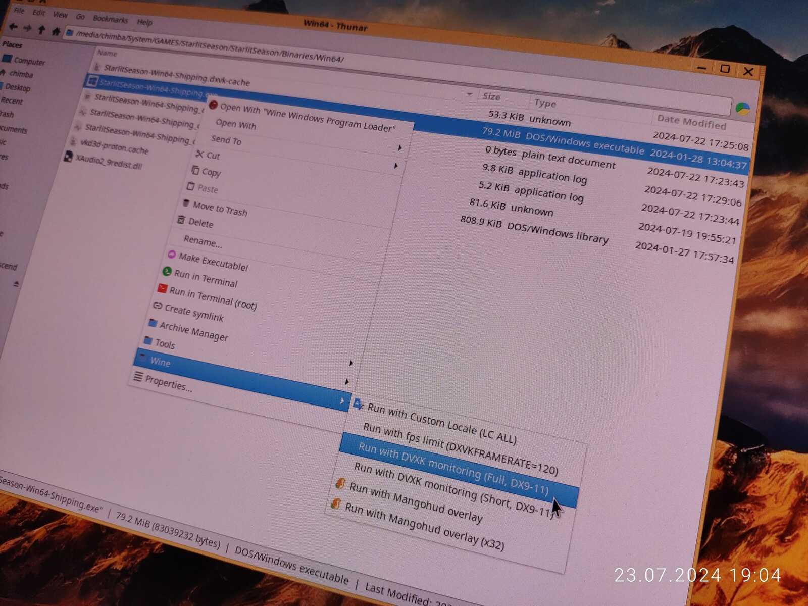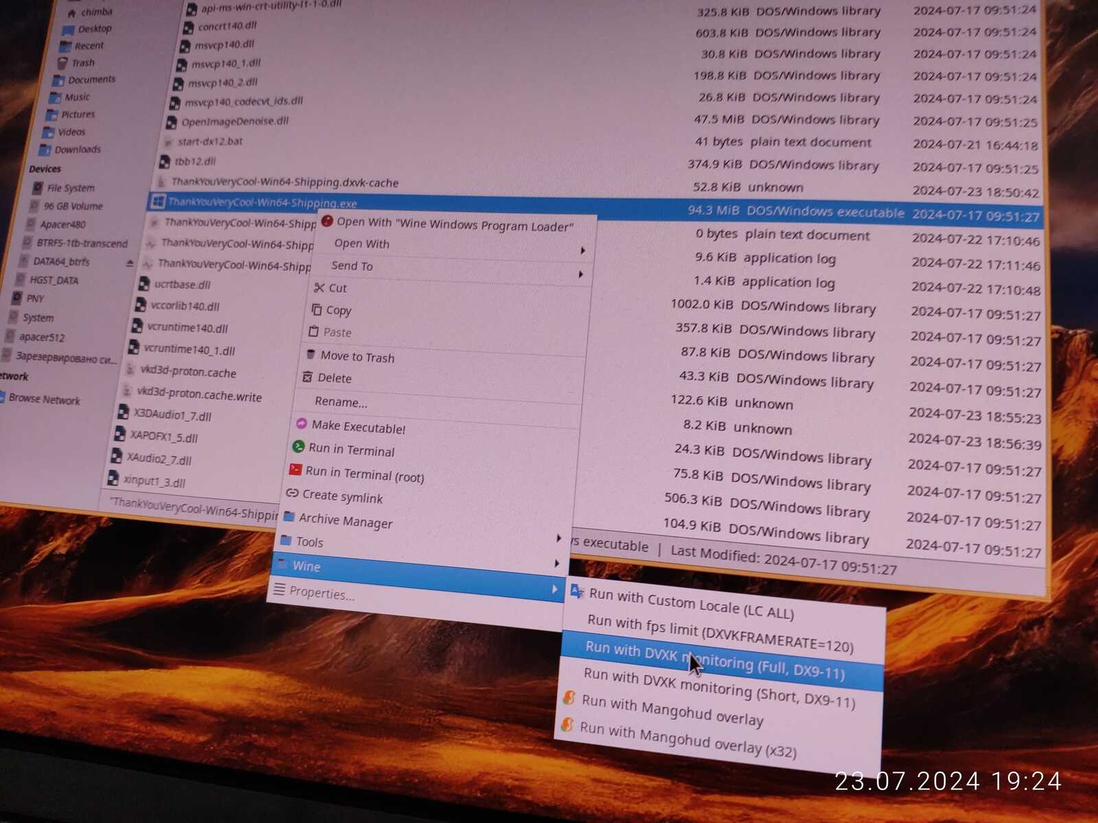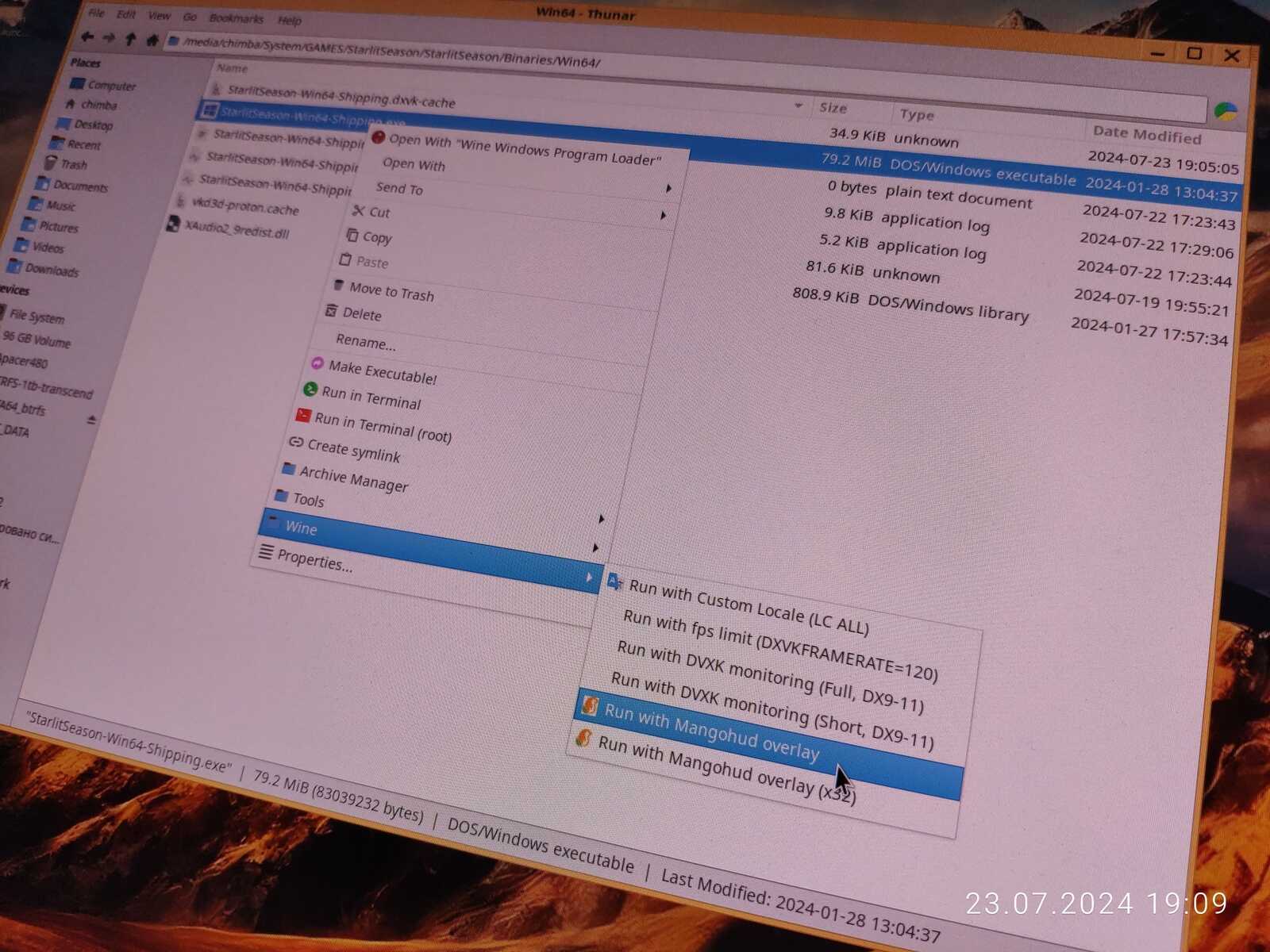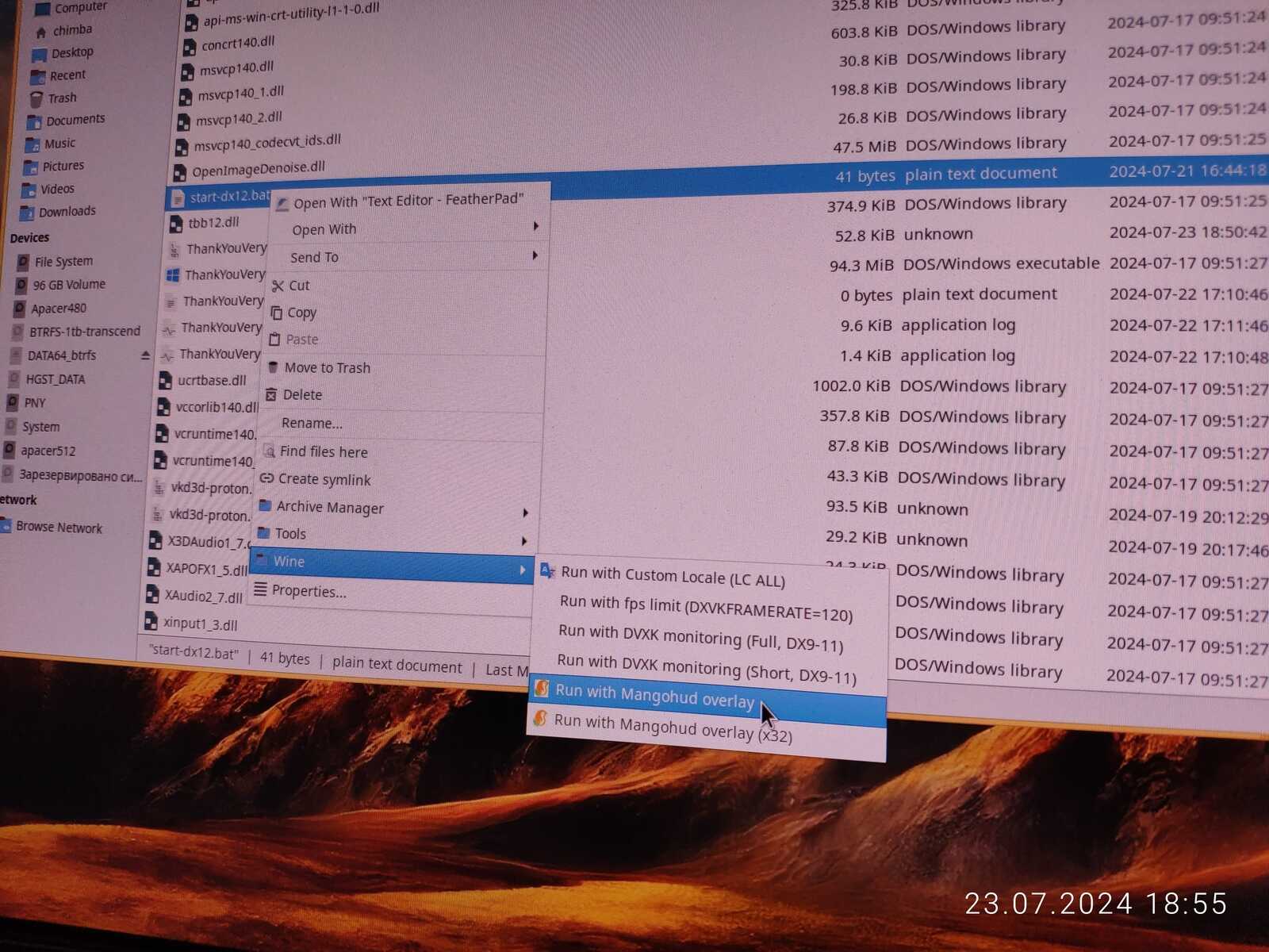 Кстати, в качестве дистрибутива Linux выступает Chimbalix 24.2 Alphachi Dev, она почти полностью соответствует текущей доступной версии Chimbalix 24.3 Alphachi, потому просто беру, и через контекстное меню запускаю игры с мониторингом DXVK/Mangohud в зависимости от API: