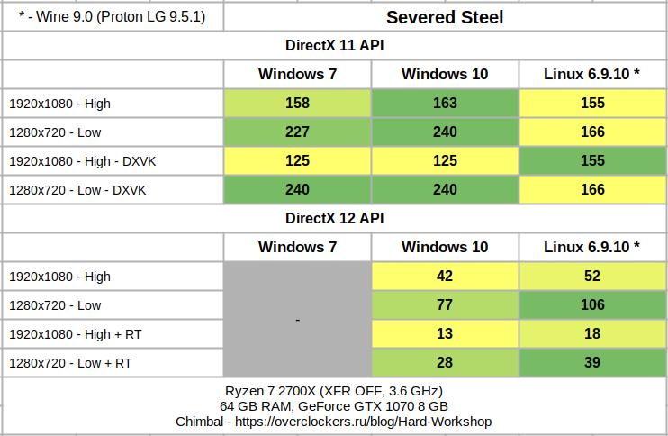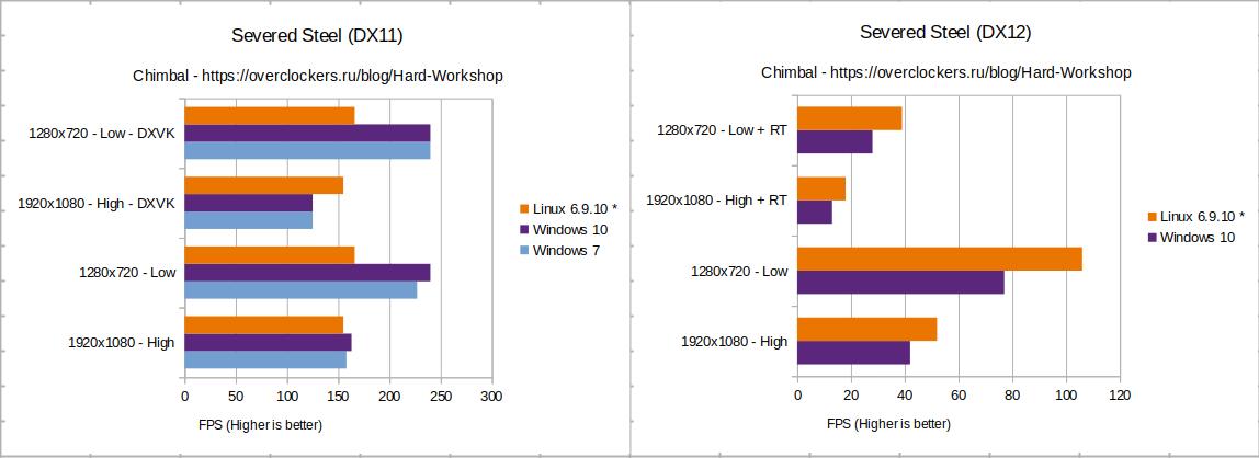 В DirectX 12 режиме преимущество обычно за Windows, однако Linux в редких случаях (через прослойку VKD3D) всё же способен выдать больше FPS, чем Windows, непонятно только какой ценой достался более высокий FPS в игре Severed Steel (DX12)... Визуально вроде ничего особо странного не заметил, так что будем надеяться, что это результаты труда разработчиков VKD3D, и ничего не ломают в работе игры.