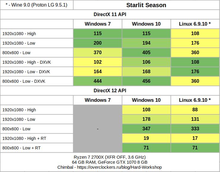 Что тут можно отметить... Linux демонстрирует немного больше FPS, чем Windows + DXVK, но Windows без прослоек остаётся недосягаемым для "пингвина", и да, пусть вас не смущает тот факт, что я продублировал результаты Linux в DX11 режиме, просто так проще работать с таблицей, сути это всё равно не меняет: