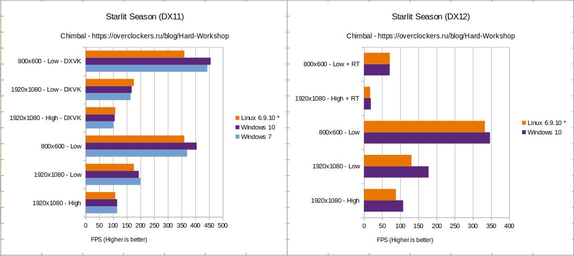 Переходим к последней игре Starlit Season и видим типичную картину, Linux не способен дотянуться до Windows, особенно в DirectX 12 режиме, но есть и интересные моменты, Windows 10 оказалась значительно быстрее Windows 7 при упоре в процессор (800x600 - Low), но прослойка DXVK вырывает старую Windows 7 на уровень более новой Windows 10.