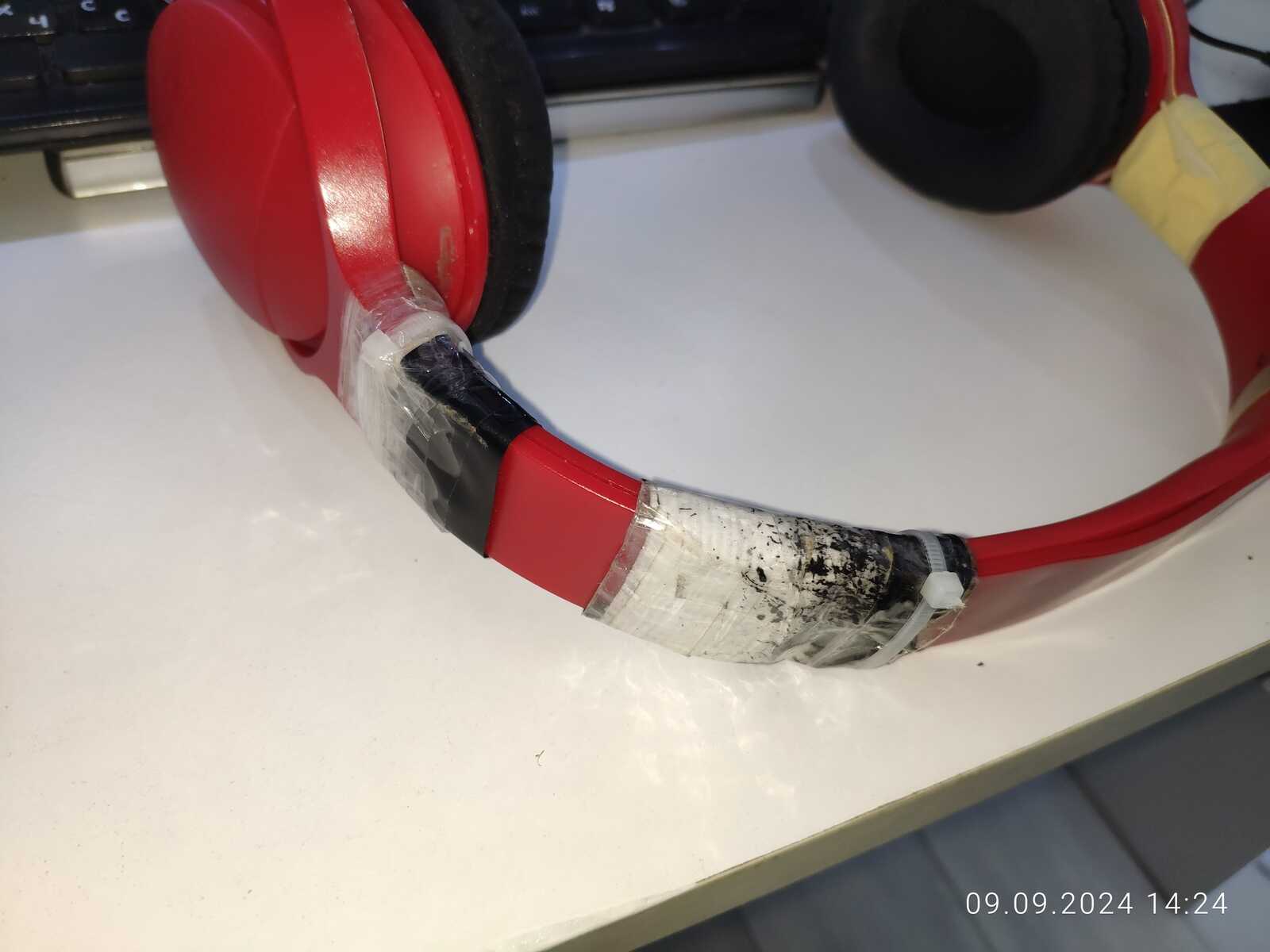 Ну да ладно, вернёмся к дешёвым наушникам, внешний осмотр говорит о том, что в пластиковом корпусе есть три перелома обильно перемотанных малярной лентой, изолентой, нейлоновыми стяжками и скотчем, короче, что под рукой было в момент поломки: