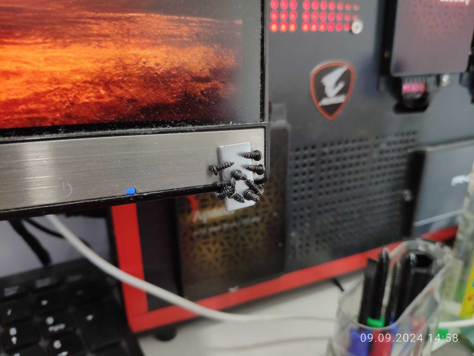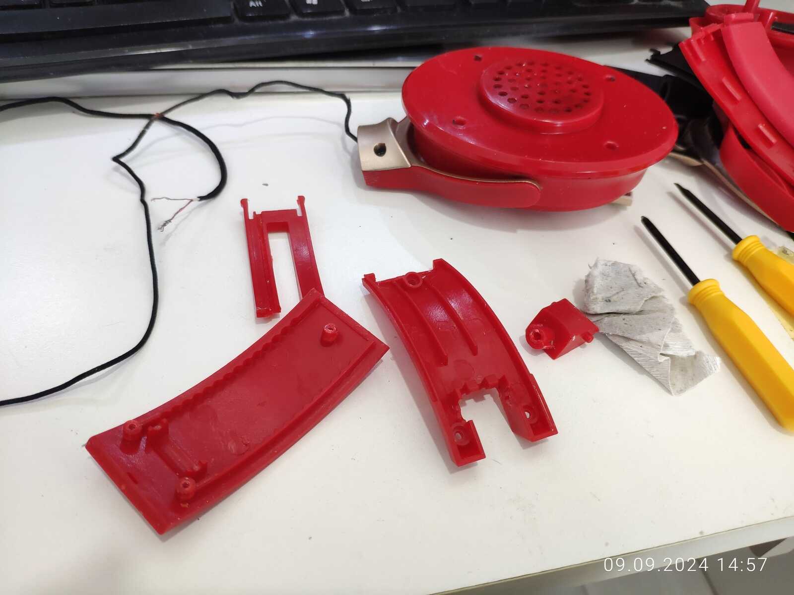 С разборкой покончено, 9 саморезов на магните и куча пластиковых деталей на столе:
