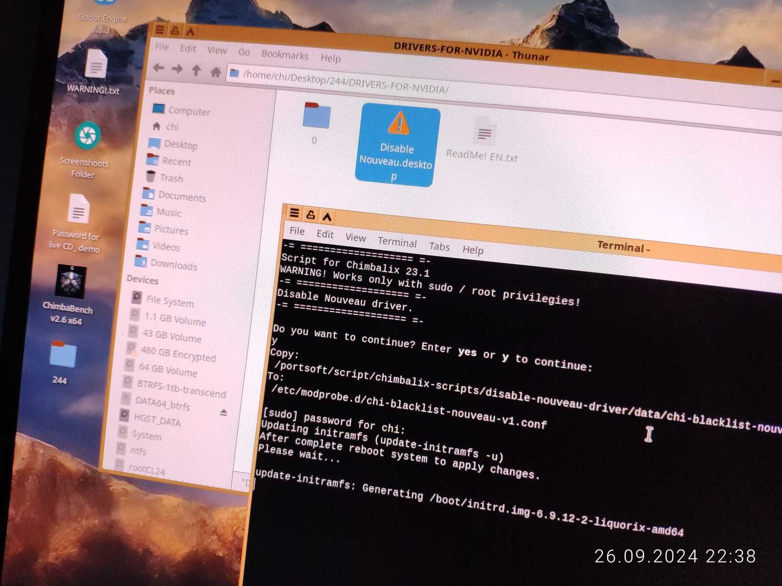 Потому я вряд ли когда-нибудь сделаю такую глупость как встраивание драйвера видеокарты в систему, да, у меня по умолчанию уже встроен стандартный Nouveau драйвер, но он выполняет роль базового драйвера, причём для его отключения в дистрибутиве Chimbalix был предусмотрен специальный скрипт, так что отключаем и перезагружаем систему, разумеется заранее скопировав нормальный драйвер от NVIDIA в домашний каталог: