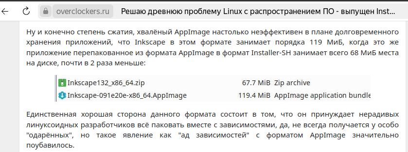 Что там еще? AppImage? Звучит прикольно, засунуть приложение в один исполняемый файл, но это один исполняемый файл, программа в таком формате нормально не кэшируется системой, что снижает общую производительность и даже порой засоряет кэш в ОЗУ, а если у приложения несколько исполняемых файлов - привет танцы с бубном через терминал, да и степень сжатия весьма паршивая: