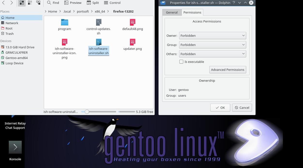 Вообще я удивлён, что мой Installer-SH даже в старом Gentoo Linux 2016 года заработал, буквально изменил одну строчку в начале скрипта, нужно будет поработать над совместимостью в следующих версиях, ведь ещё обнаружился недостаток с правами запуска, нужно будет тщательнее контролировать этот момент, хотя в других линуксах кроме Gentoo этой проблемы не было: