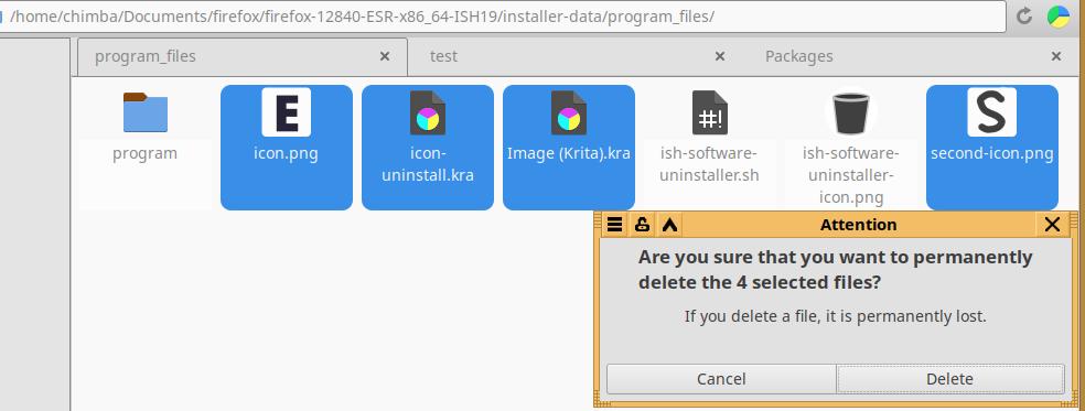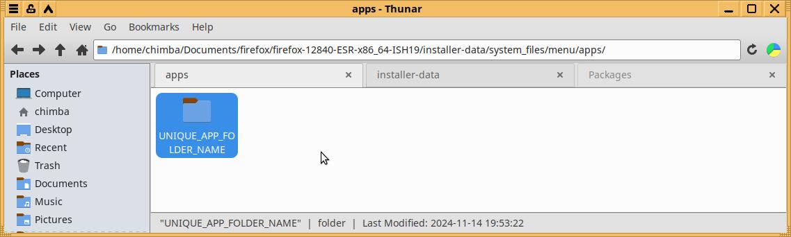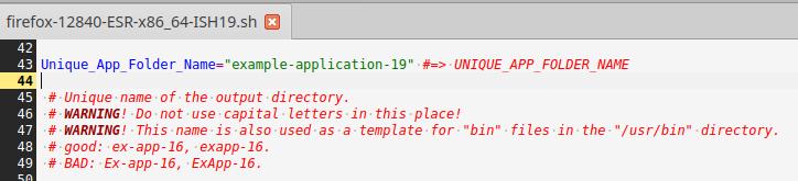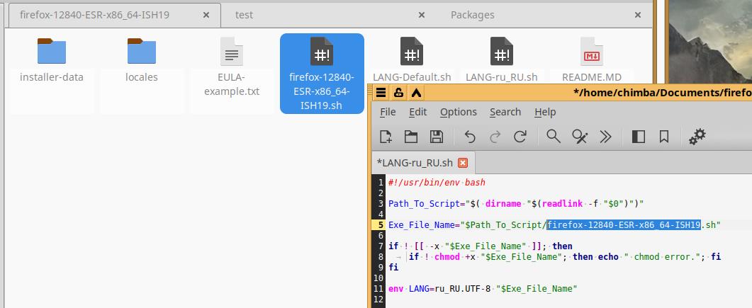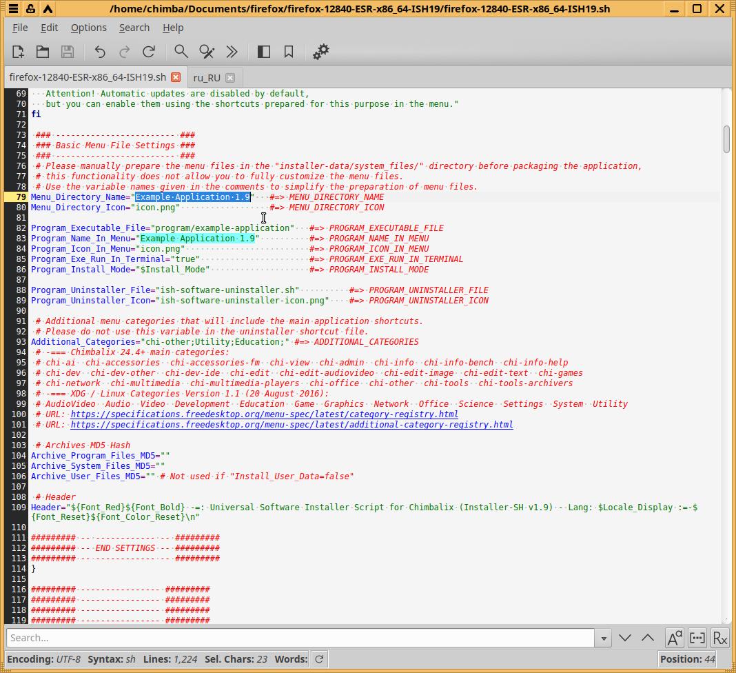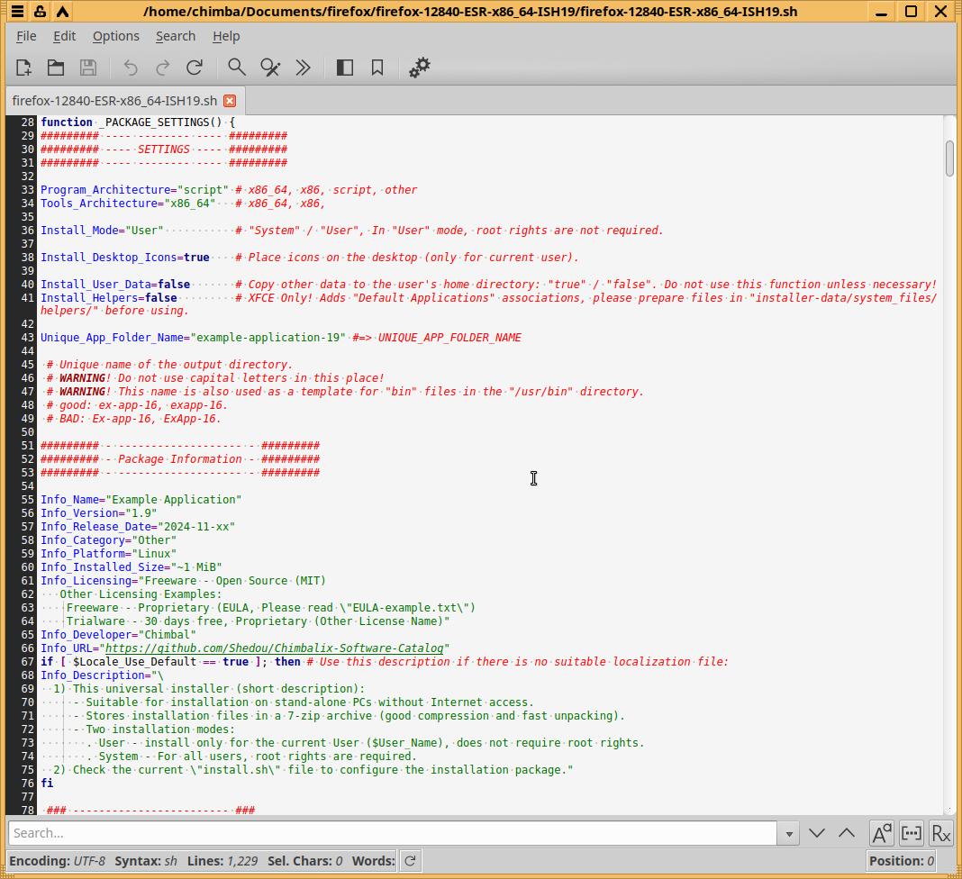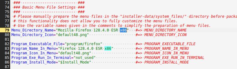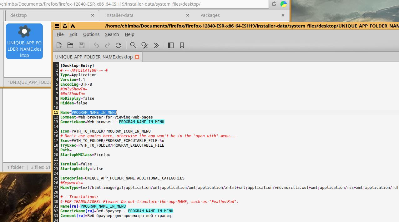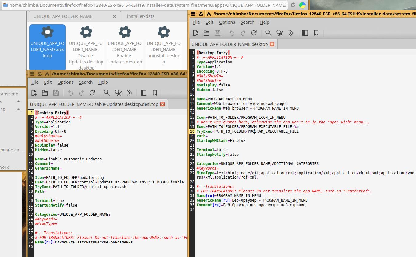 Удаляю первые два примера (но не трогаю файл "...-uninstall.desktop") и закидываю уже подготовленные файлы от другого установочного пакета Firefox в формате Installer-SH, при необходимости вношу правки, но тут такой необходимости нет, так что оставляю как есть: