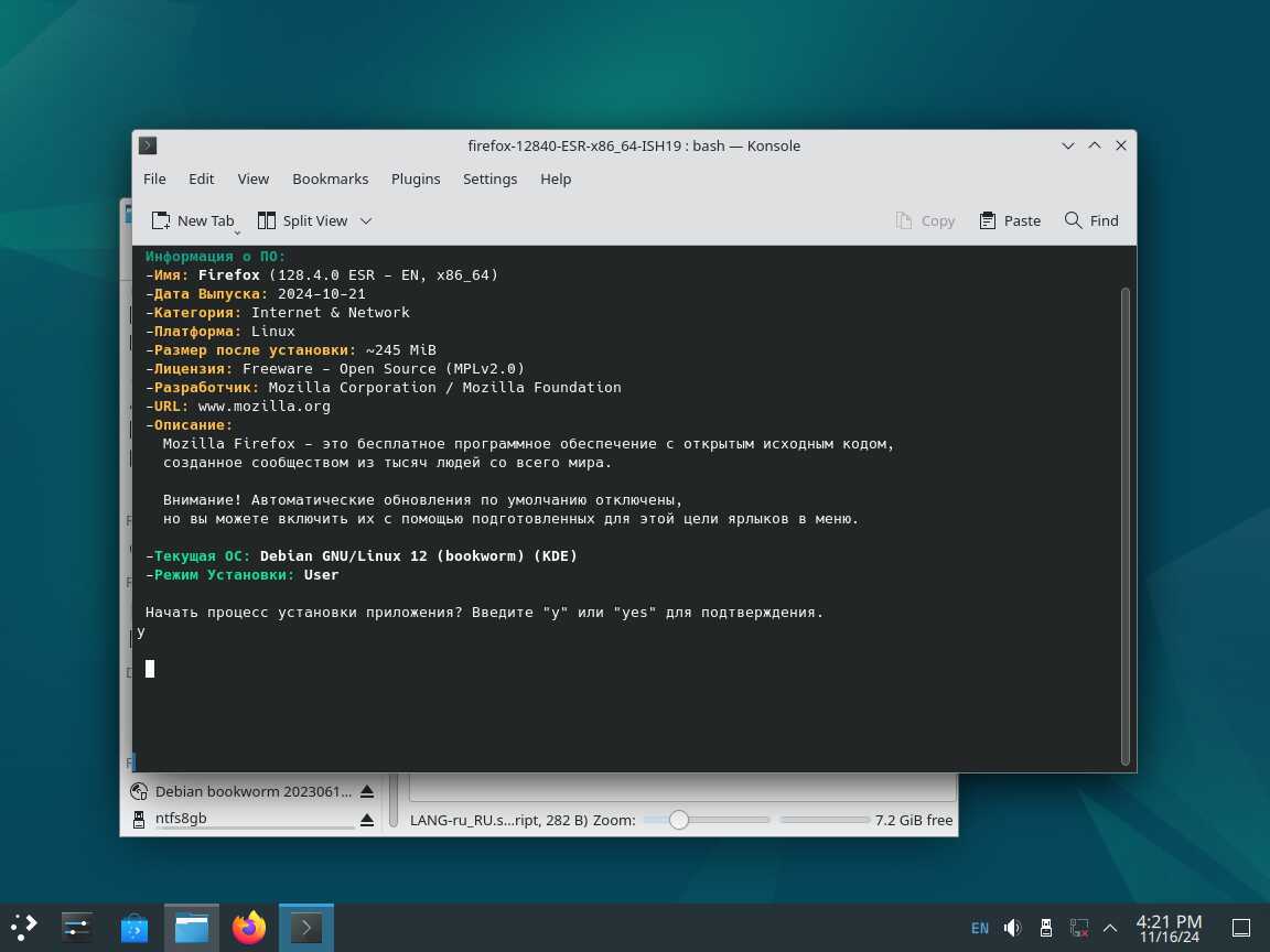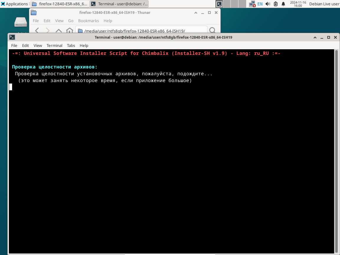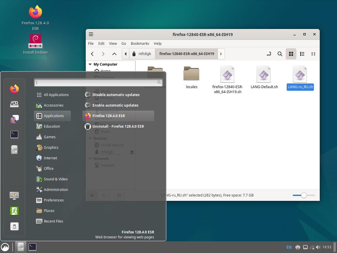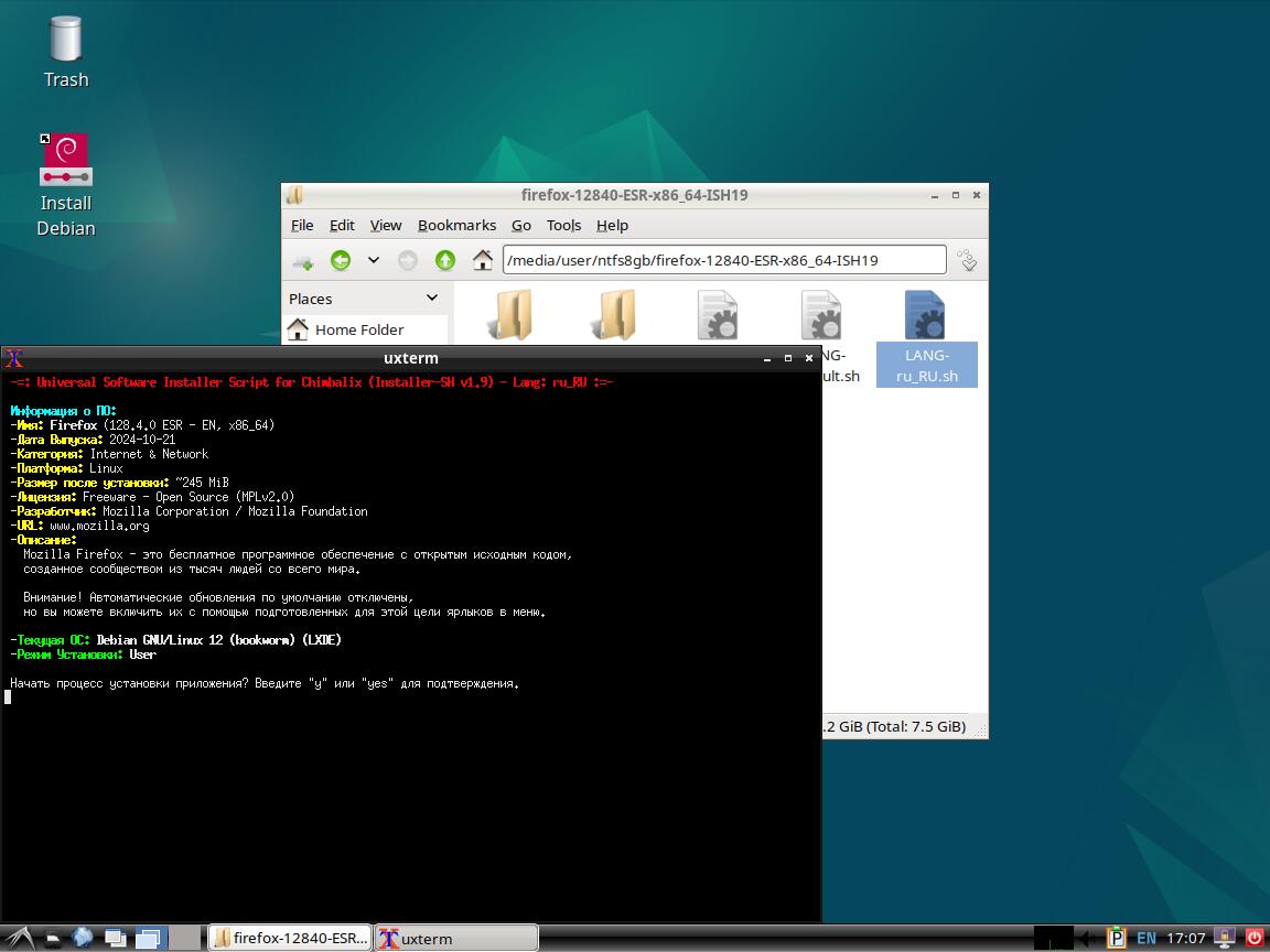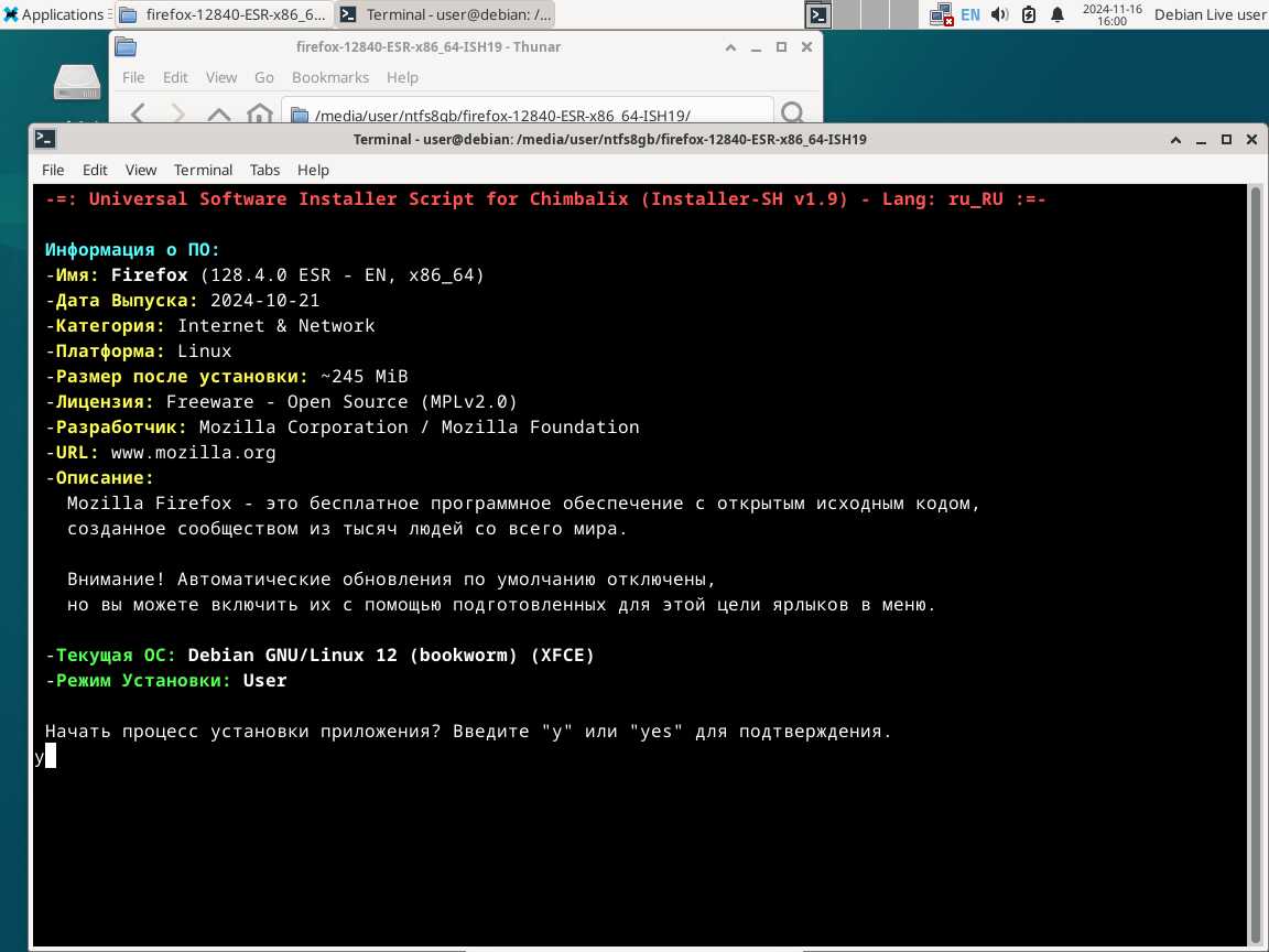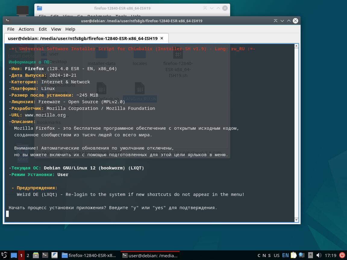 Следом был собран автономный установочный пакет браузера Mozilla Firefox 128.4.0 ESR в формате Installer-SH, там же кратко были расписаны проблемы обычных линуксоидных способов распространения программ, почему собственно я решил разработать свой установочный пакет.
