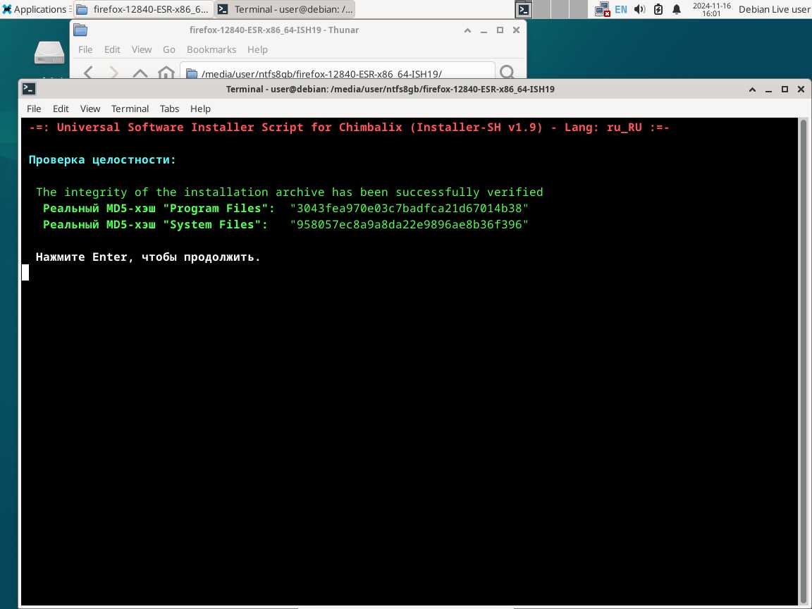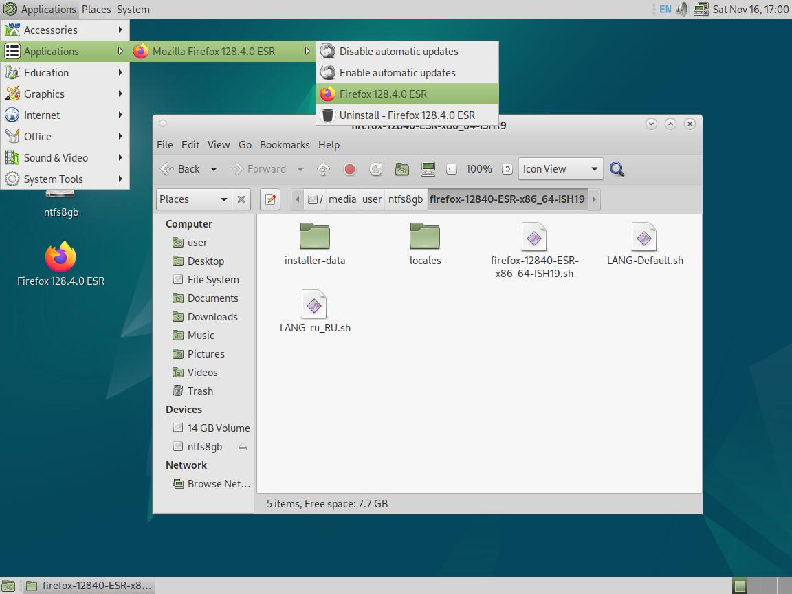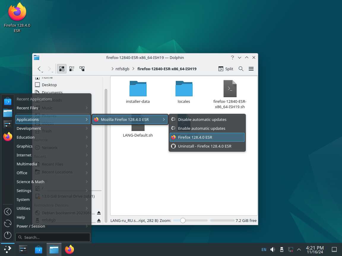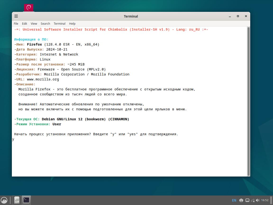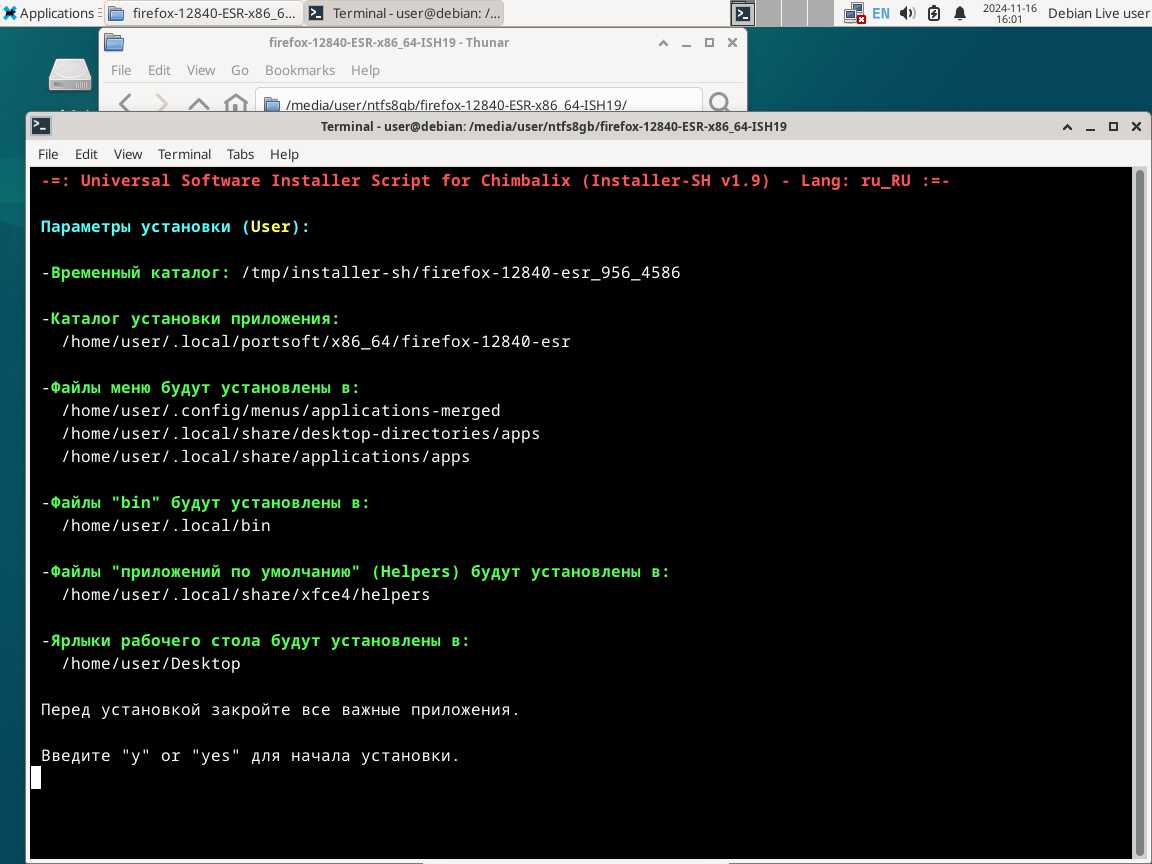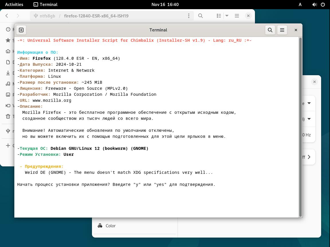 Следом был собран автономный установочный пакет браузера Mozilla Firefox 128.4.0 ESR в формате Installer-SH, там же кратко были расписаны проблемы обычных линуксоидных способов распространения программ, почему собственно я решил разработать свой установочный пакет.