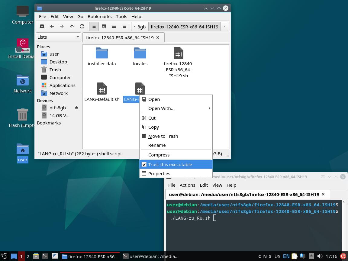 Тест установочного пакета Mozilla Firefox в формате Installer-SH v1.9: Debian 11 и Windows XP