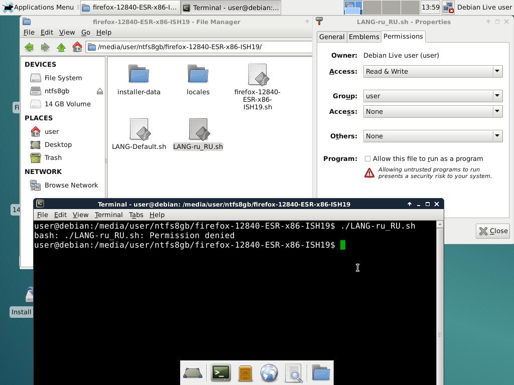 Тут тоже пришлось копировать установочный пакет в домашний каталог и выставлять права, ибо Debian 8 не позволяет запускать прямо с флешки под файловой системой NTFS.