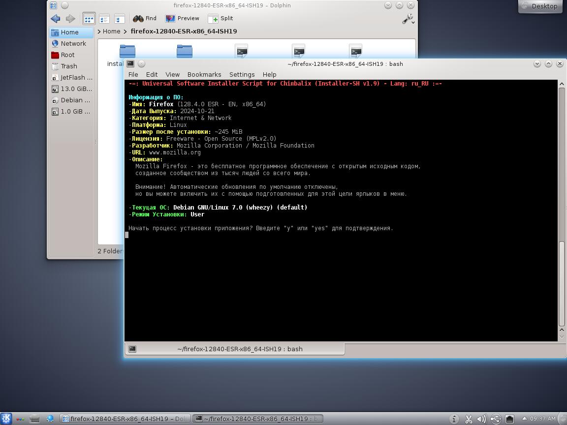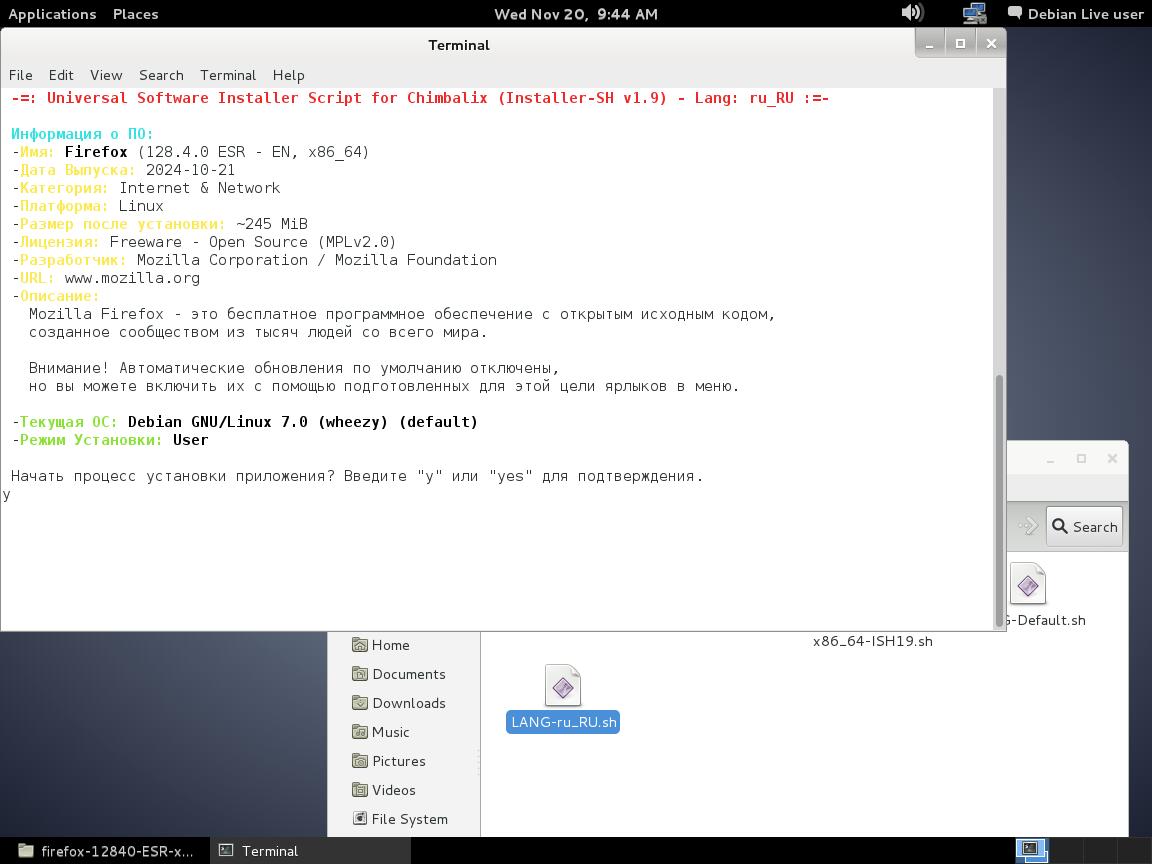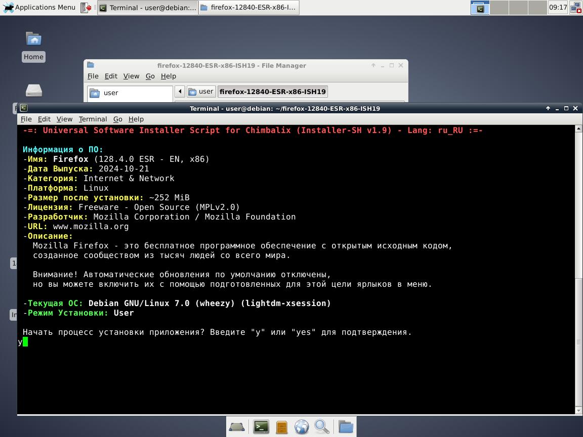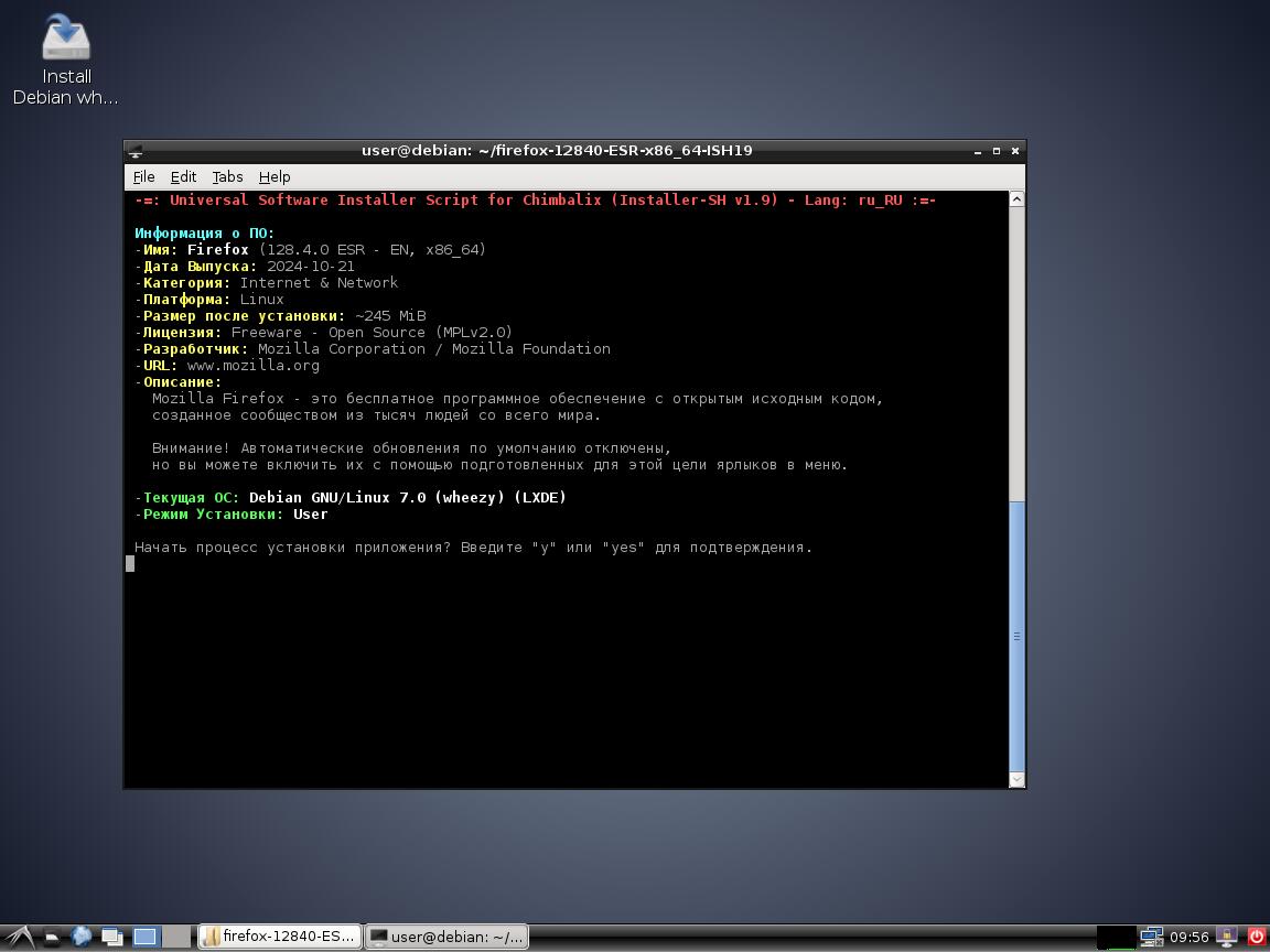 5) Тестируем Installer-SH v1.9 с браузером Mozilla Firefox 128 в Debian 8