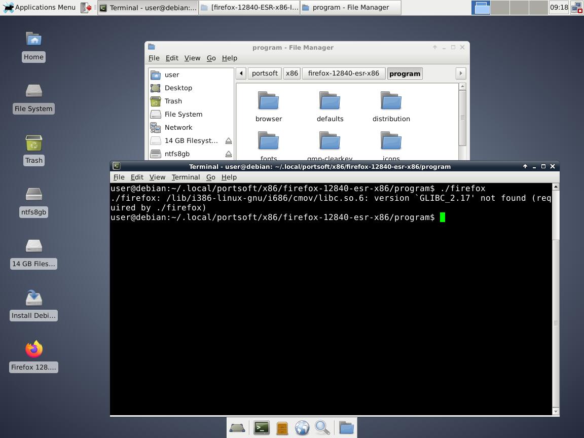Ярлыки меню на месте, однако браузер не запускается, увы, но Debian 7 слишком стар для Mozilla Firefox 128.4.0 ESR, требуется GLIBC версии 2.17 или выше: