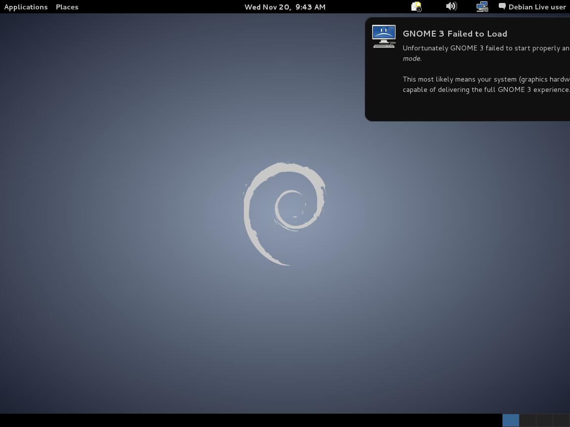 Современный GNOME показал себя плохо, кроме Debian 7. Именно в Debian 7 данное рабочее окружение показало наилучшую работоспособность, только ярлык рабочего стола потерялся, но более новые версии GNOME явно деградировали.