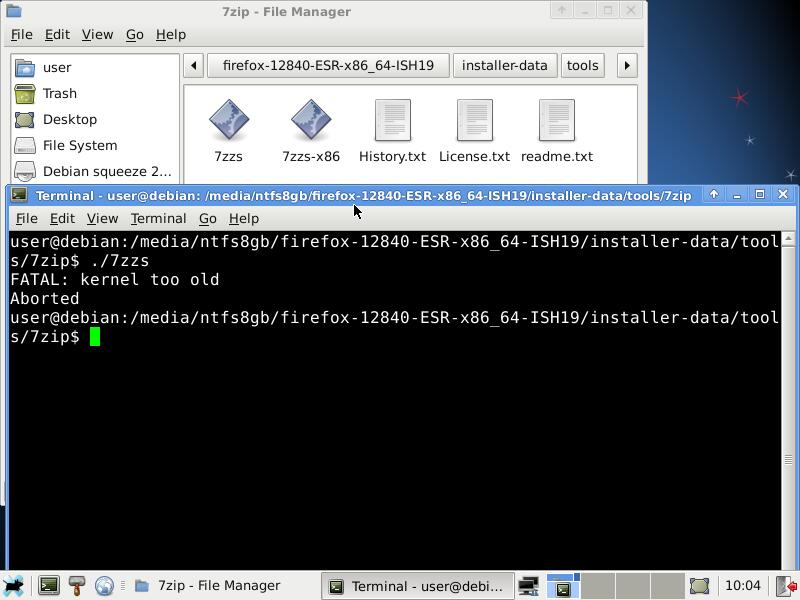 Но увы, хоть сам Installer-SH и работает в Debian 6, но вот архиватор 7-Zip уже не работает, ругается на слишком старое ядро линукса: