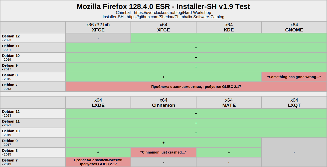 Начнём с работоспособности браузера Mozilla Firefox 128.4.0 ESR – в целом большинство дистрибутивов справились с задачей, кроме Debian 8 GNOME, Debian 8 Cinnamon и всех редакций Debian 7, но тут в основном всё зависит от того, как разработчики собрали приложение: