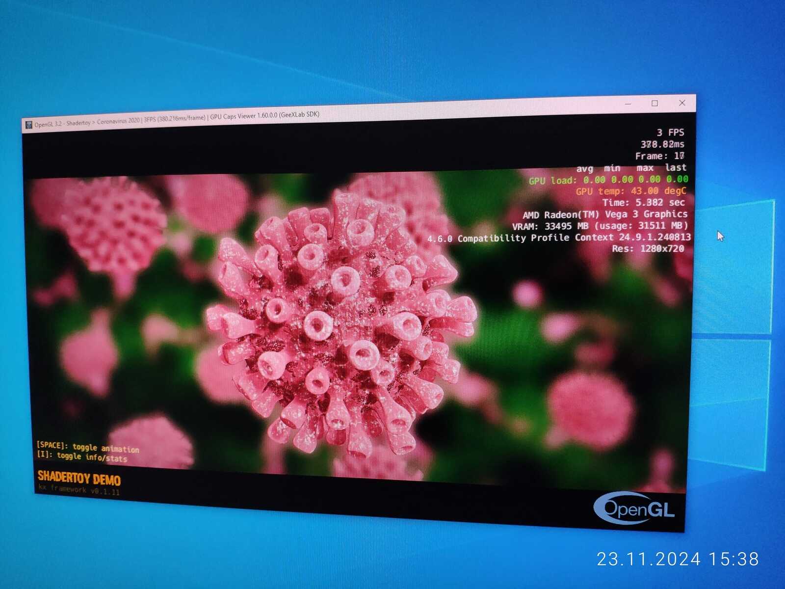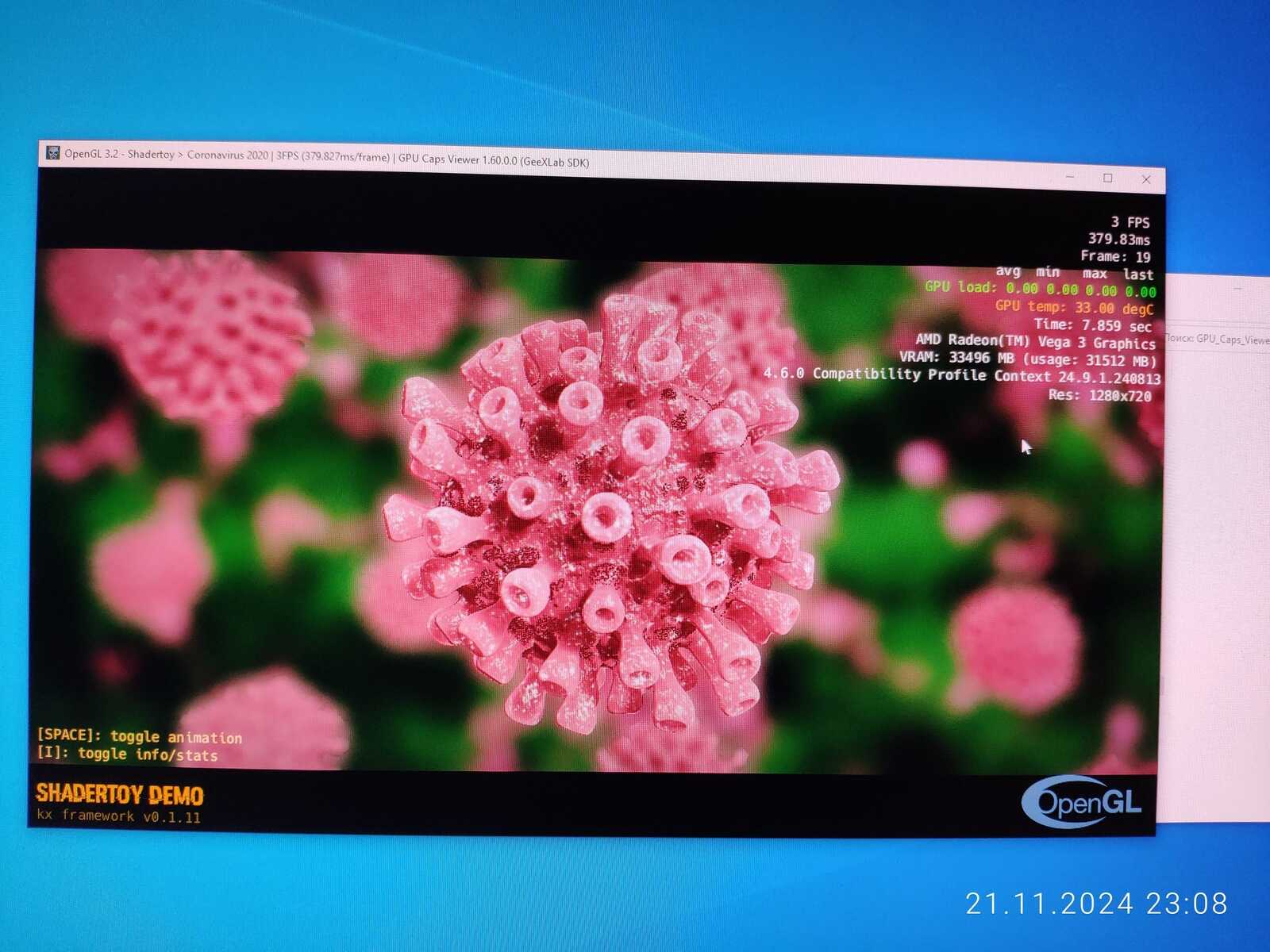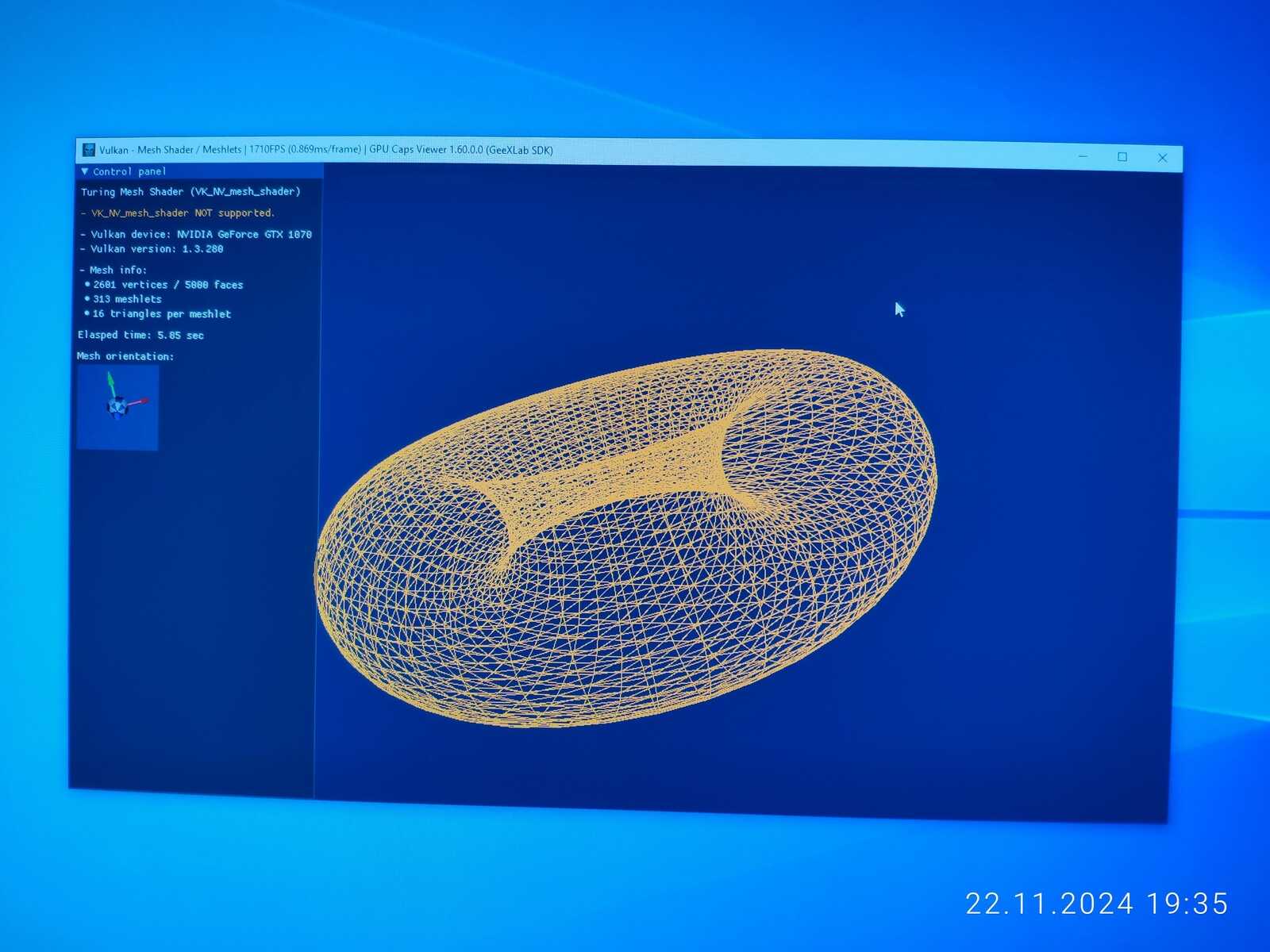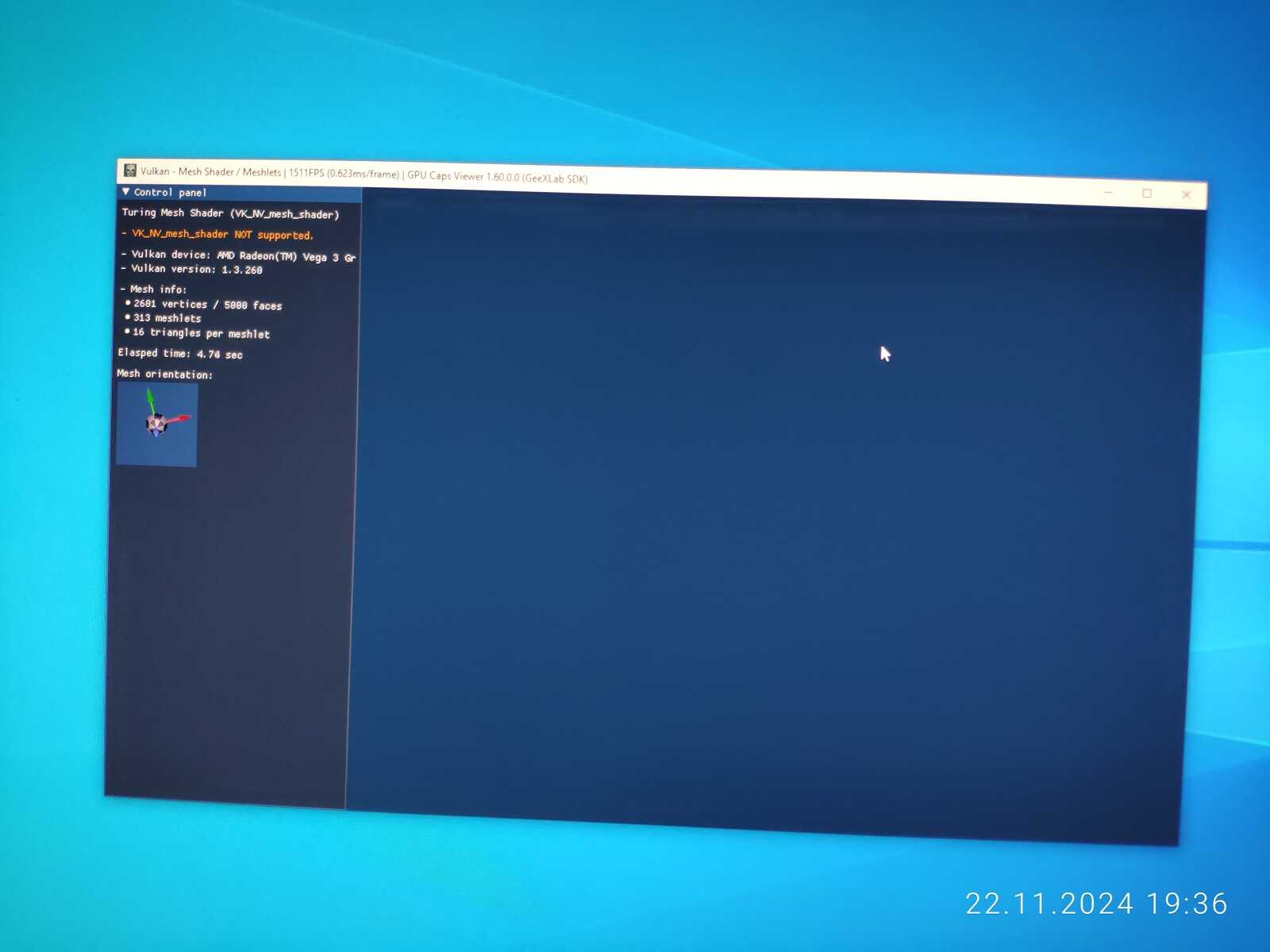 Ради интереса запустил первый Vulkan тест, он на обе видеокарты ругался что не поддерживается расширение VK_NV_mesh_shader, однако GeForce GTX 1070 нарисовала бублик, а Radeon Vega 3 не смогла ничего нарисовать, увы: