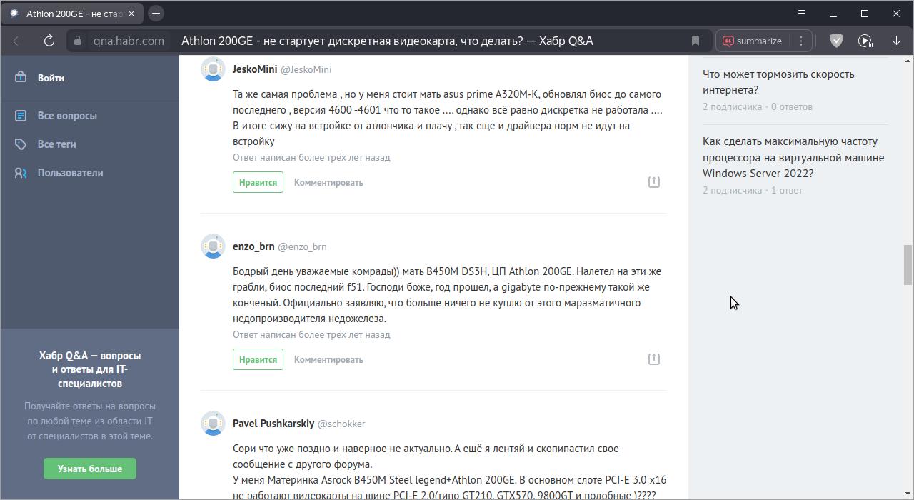 Но знаете что потом выяснилось? Правильно, я далеко не первый с такой проблемой, когда вместе с Athlon 200GE не стартует дискретная видеокарта, причём этой проблеме подвержены были практически все системные платы, Asus, Gigabyte, ASRock, MSI, ну короче все основные производители системных плат точно сталкивались с проблемой, но какие-то производители исправили проблему, а какие-то нет, и в моей системной плате эта проблема явно не исправлена: