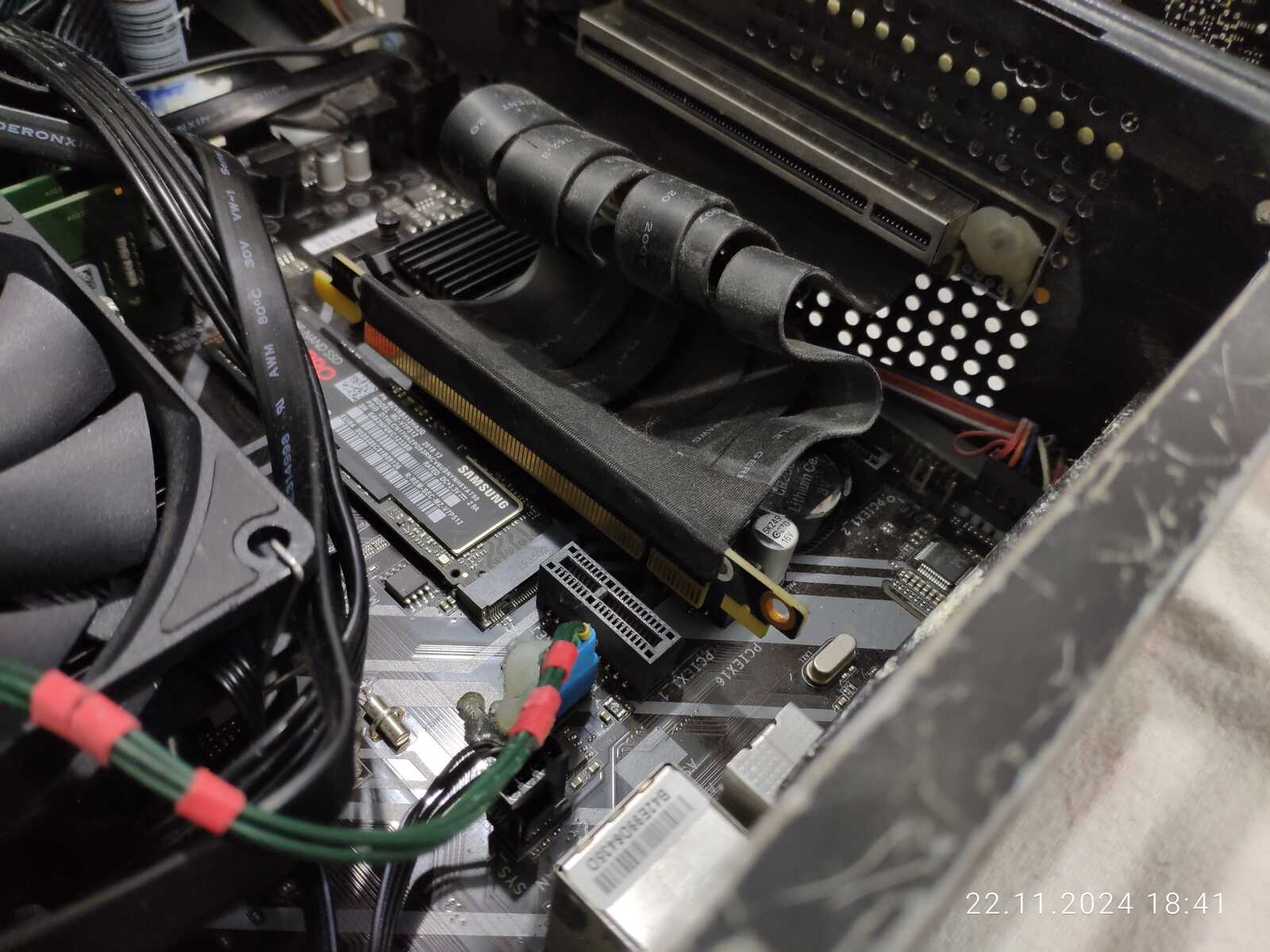Может показаться что теперь PCI-e штекер давит на SSD, но это не так, там есть свободный зазор, да и охлаждению это никак не помешало, возможно даже улучшило судя по температурам уже в собранном виде, но это я уже забегаю вперёд: