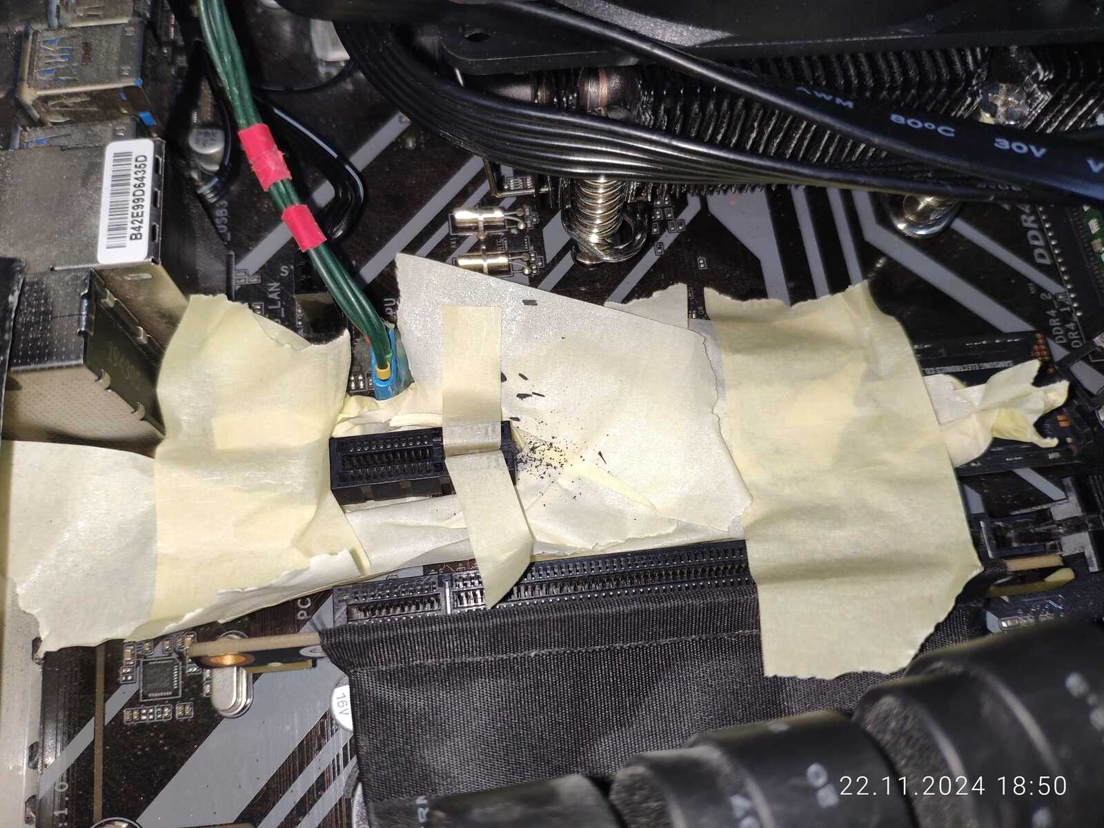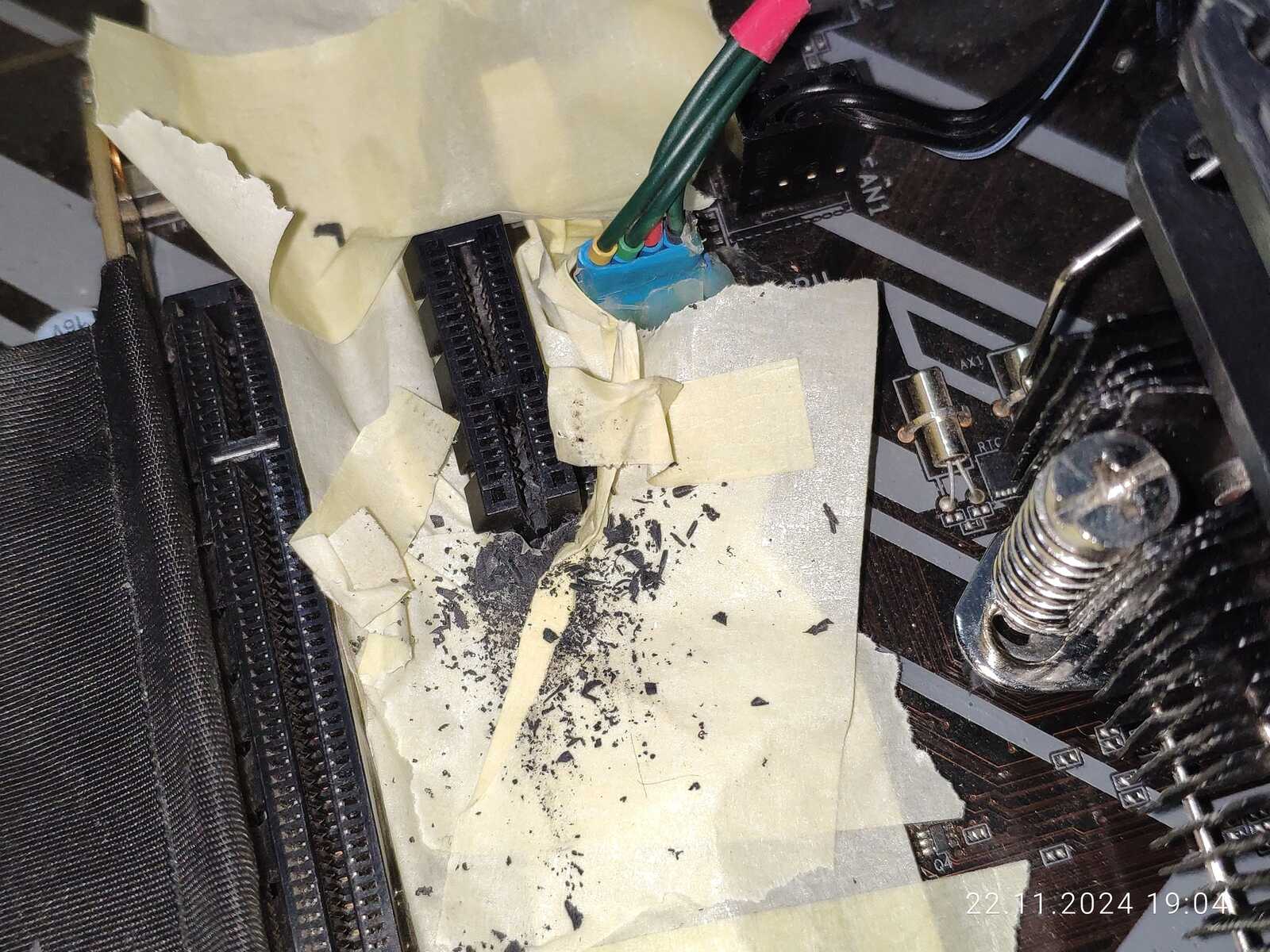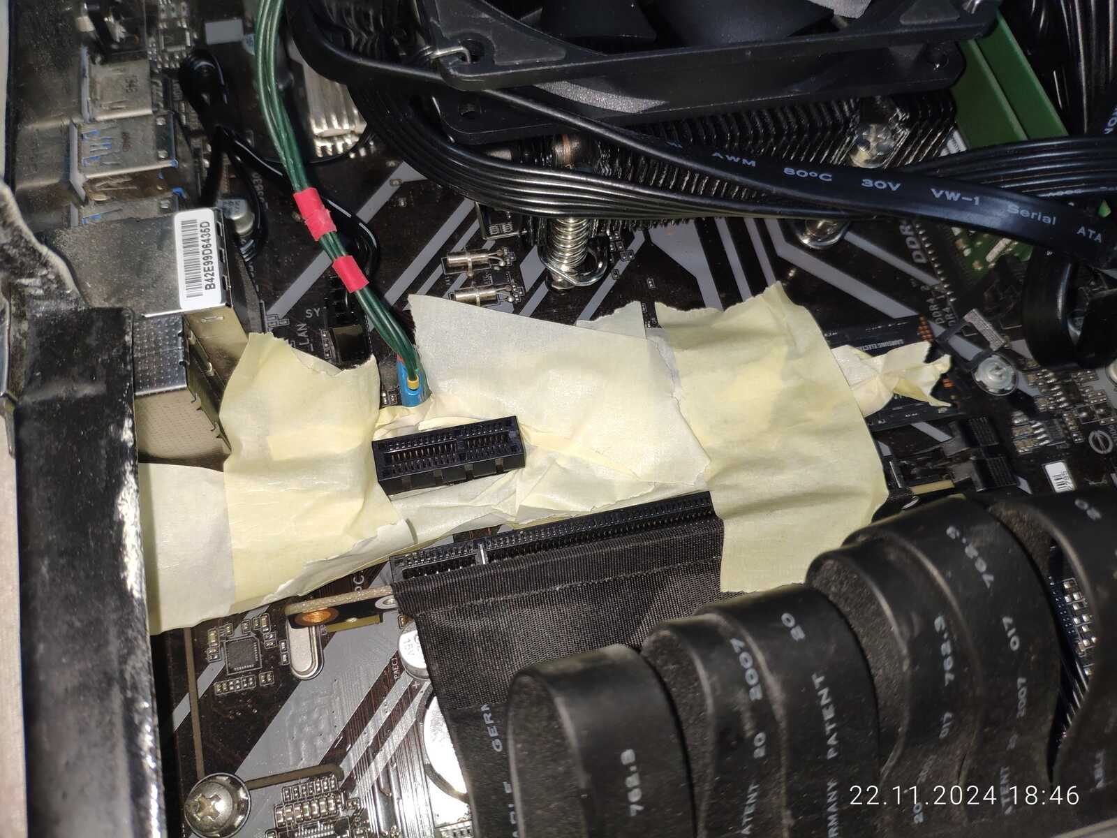 Райзер нужно закрепить в гнезде, но креплений никаких нет, потому импровизирую при помощи многожильного, весьма прочного провода, не забываю про изоляцию обрезанных концов, мне не нужны сюрпризы со временем: